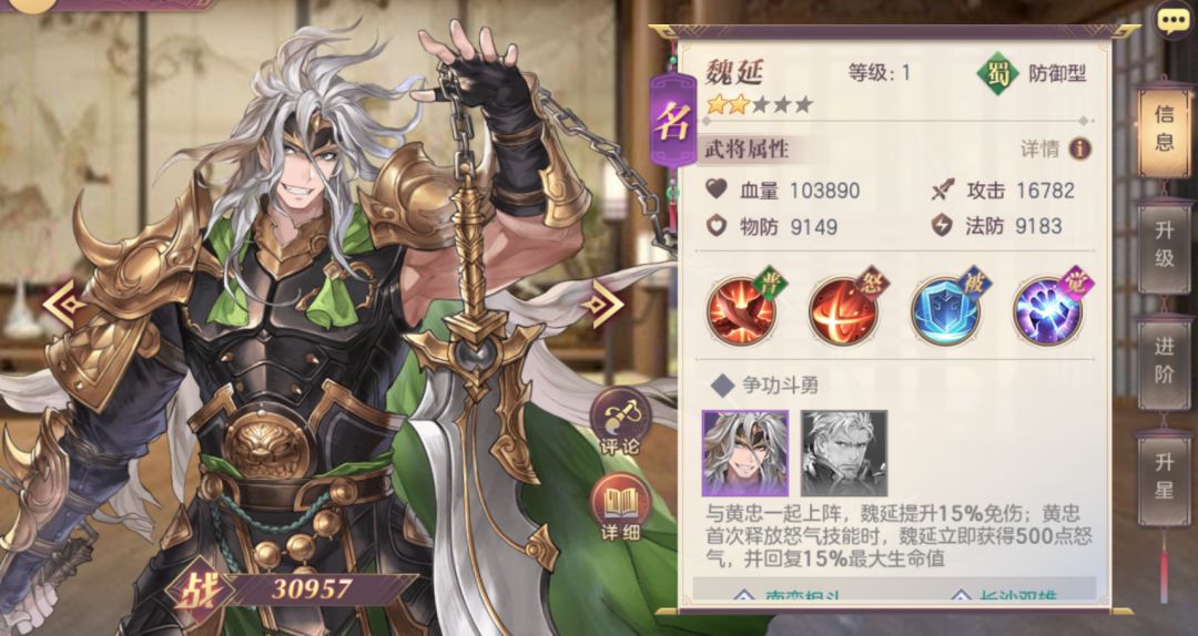羁绊:与黄忠一起上阵,魏延提升15%免伤。黄忠首次释放怒攻后,魏延获得500怒气,并恢复15%生命。