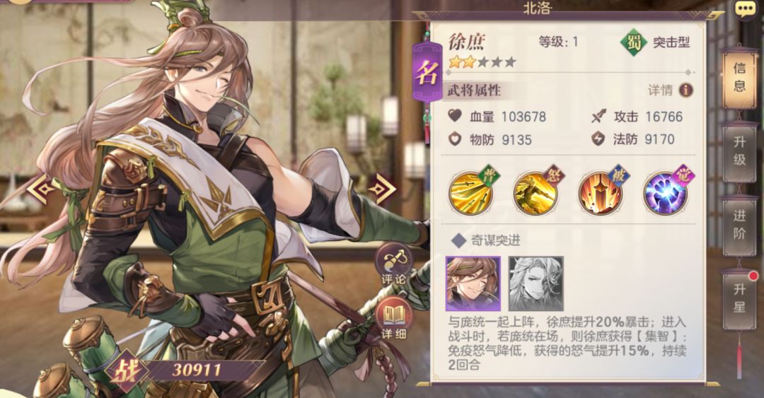 羁绊:与庞统一起上阵,徐庶提升20%暴击率。同时徐庶前两回合获得的怒气增加15%,并免疫怒气降低效果。