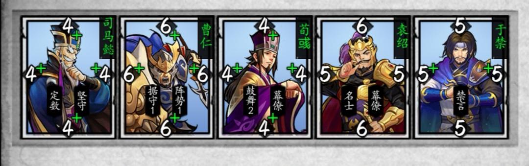 这套牌的思路其实和上面的差不多,都有种不动如山的感觉,因为5:4就可以赢。所以我们只需比对面多一张就可以,先手的话,我们只需要把工事清了,再保证自己的所有五张不被翻就可以了(任何五张都可以)。先手的话, ,可以曹仁清工事,然后袁绍贴曹仁,荀彧贴袁绍或者曹仁,接下来司马懿坚守 最后于禁收尾。其实也不一定这一种思路,也可以先手司马懿清工事,袁绍或者荀彧贴司马,机会好还可以于禁找个角落发动禁言(因为点数不高所以找角落控制对面技能)下面可以袁绍或者曹仁 先后手都差不多 先手只要 把自己的阵布好。后手只要顺带保护自己的同时翻对面一张就可以取得胜利。
