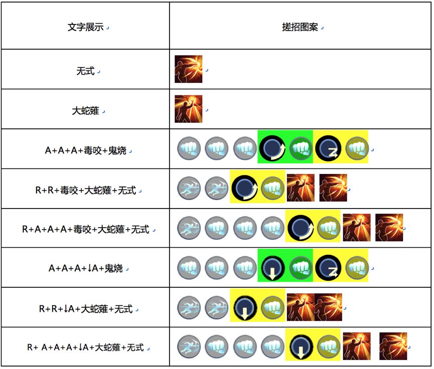 图表中【拳头】=A、 【冲刺】=R、 图标连起高亮代表搓招。