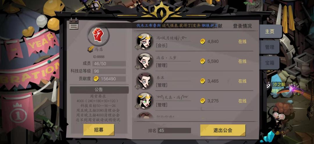 96级科技公会招人,ID8888,周贡献要求4000,每周五周日踢一次人,欢迎新老玩家加入,最好是长期玩家,不轻易退游。可加vx:hyz44444进群,群内气氛活跃。