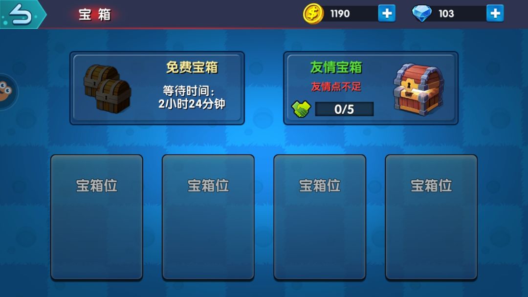 游戏中获得英雄的方式就是……啦啦啦,开宝箱!箱子的设定类似于皇室战争中的设定,有四个宝箱位,两个免费宝箱位吧。宝箱通过对局即可获得,开宝箱的时候需要占用一个宝箱位,在一定时间和才能获得箱子里面的奖励。免费宝箱则是按时刷新,每隔一段时间会获得一个宝箱,最多储存两个。当然,免费宝箱的奖励肯定要便宜一些。除此之外的「友情宝箱」则要听过赠送好友卡片获得,五个有情点=宝箱,所以强烈建议玩家,特别是妹子一定要找个伙伴,嘿嘿(๑•̀ㅂ•́)و✧还要注意的是,游戏中似乎是无法主动送卡片。