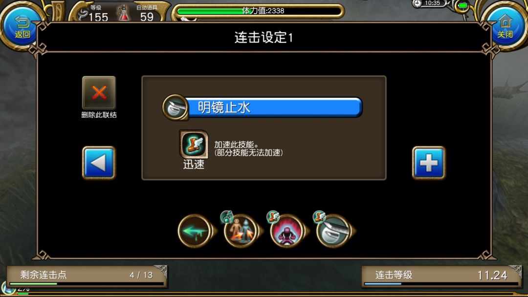 粘液射击—分身(补位)—怪力(迅速)—明镜(迅速)。一蓝放分身。怪力可以提供一波高速回蓝(怪力在分身后面分身能吃到buff),最后的明镜使接下来的平a百暴。闪避比较低的boss可以不加明镜,怪力改成增幅