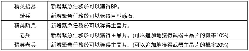 ▶ 在製作清單裏新增了6種主裝備。製作時需要的武器主晶片可以在大於等於老兵級地緊急任務上機率地獲得。