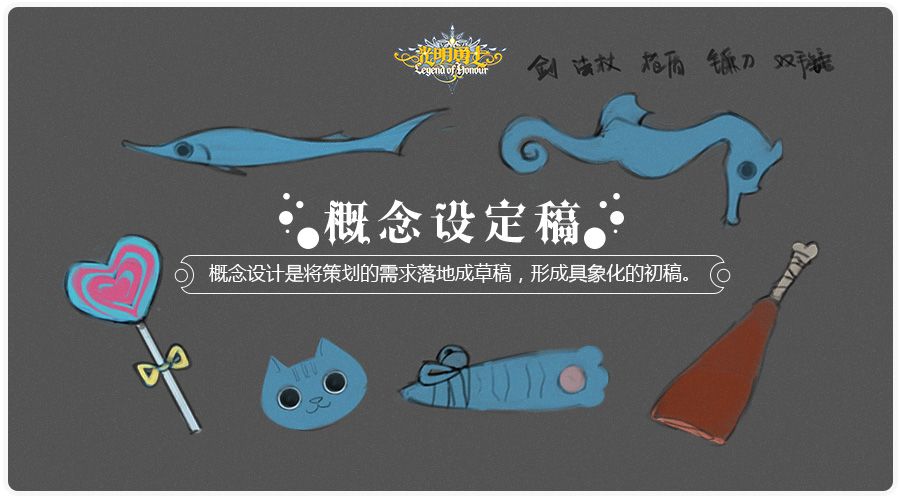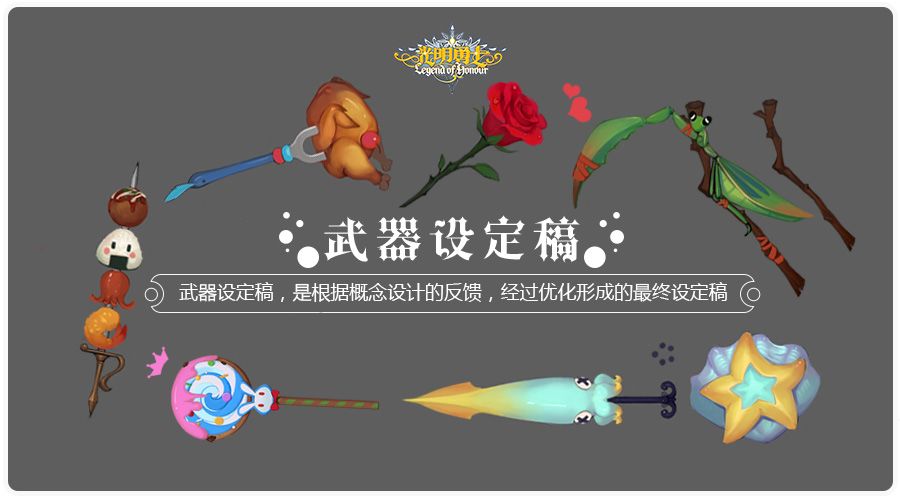 但,我们不一样!!!《光明勇士》就是要做不一样的烟火。所以,在本策的强烈要求下,美术大大们,给游戏设计了一套全新武器外貌,萌主们且随本策一起,设计一些Q萌可爱的武器。