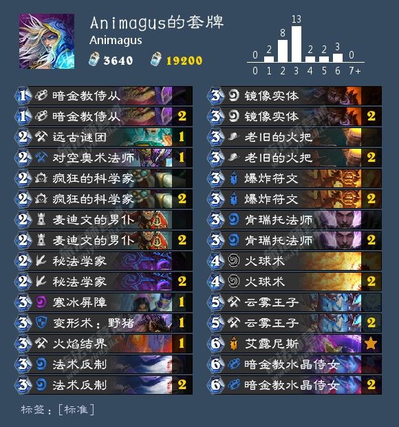 这套卡组的尘数为【3640】尘,其中的橙卡 艾露尼斯 是很重要的,前期我们挂奥秘下随从手牌消耗的会特别快,所以橙武的续航会让我们对敌人造成非常大的压力,套牌中的直伤特别多(保底所有伤害:麦迪文的男仆3*2、云雾王子6*2、火把9*2、保底爆炸符文3*2、火球术6*2=50点直伤),对局节奏也很好,新奥秘火焰结界、对空奥数法师对抗大多数铺场型快攻卡组都是很克制的,紫卡寒冰屏障(冰箱)能让我们额外活一个回合,冰箱是让我们致胜的一个关键,好多对局基本上全是靠苟的这一个回合胜利的。