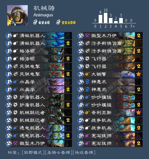 起手留水晶学、污手街供货商、风驰电掣、通电机械人、机械跃迁者,个人认为神恩术起手不必留,多一个怪就能多buff一个。到了4费左右就是我们场面爆发的回合了,如果再贪一点5费亮石技师6费场面就爆炸了,一个个6攻8血的机械在场上无人能敌,或者神恩术加亮石技师再buff一波。飞行器配合磁力甚至能一回合直接踢死对面,或者贴上奇利亚斯把损失的血量全给吸回来。也有时,我们会觉得亮石技师会很卡手,因为前期就已经靠减过费用的机械手牌全部打空了,可以替换成基维斯,觉得神恩术卡手也可以换成基维斯,两个都想换那就换成吵吵机械人、基维斯。