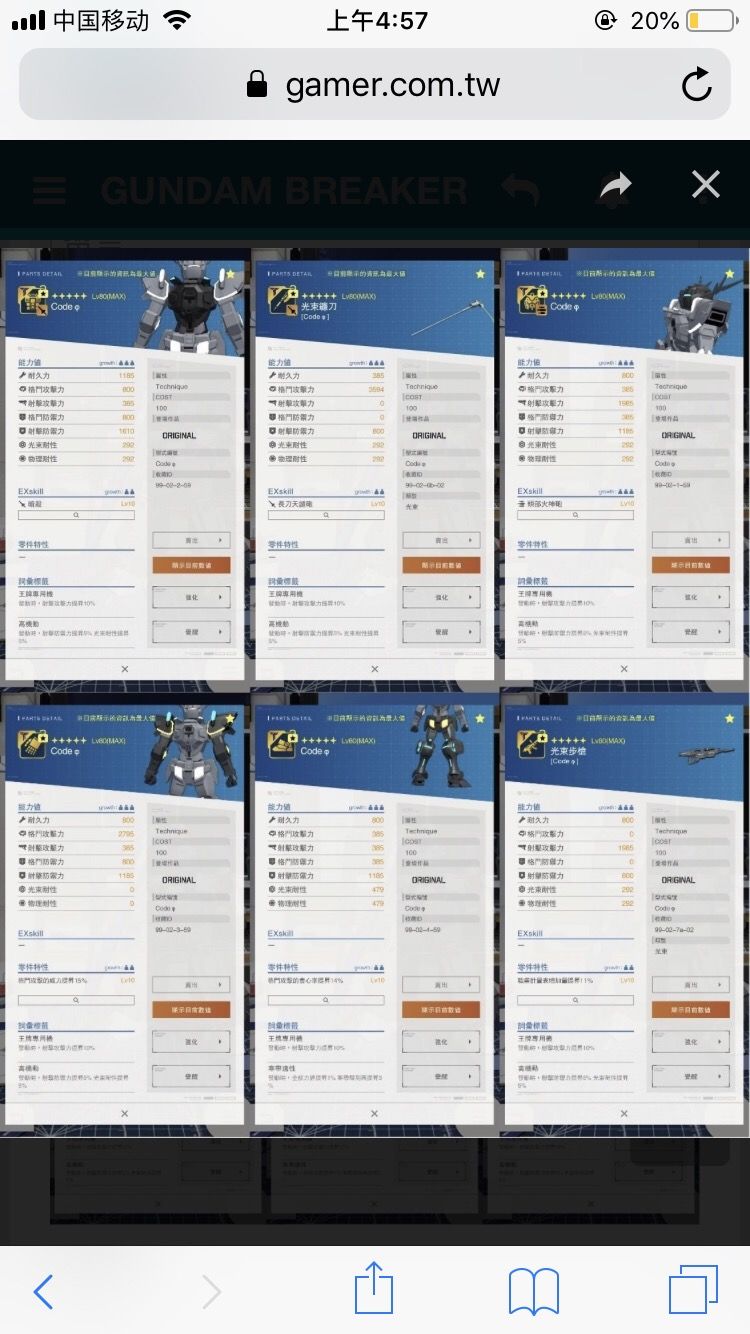 這是code零件的全部數值 大家可以參考一下(圖片有點模糊 大家見諒!放大還是能看清楚的 轉自其它的論壇) 特別鐮刀強度非常可以 格攻達到3k+了 這套機子的詞彙也不錯 都是很派上用場的 就是太難掉了