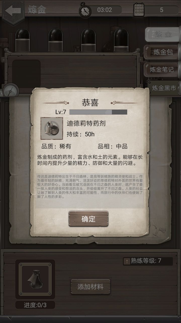 迪德莉特药剂(楼主强烈推荐,材料简单又很实用):提升少量的精力、防御和大量的闪避(提升防御神马的有直接闪避更好吗,节省生命和精力,能在野外生存更久)