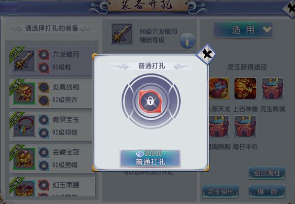 『装备打孔』可以对90级以上的装备开孔,开孔可以使用30000银币或者一定数量的金刚钻,会开出红色、蓝色、黄色三种不同颜色孔。