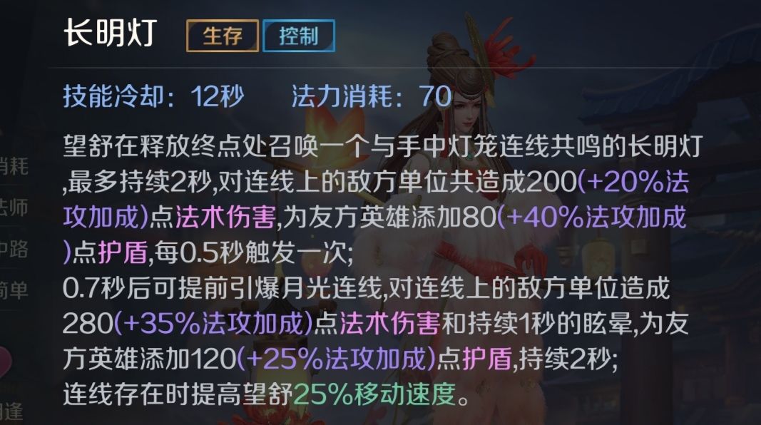 望舒在释放的终点召唤一个灯笼并与他连线,最多存在2秒,对连线上的敌人造成伤害,对友军的话,会给他添加一个护盾。望舒可以提前引爆连线,(即使不手动引爆,连线也会在2秒后自动爆炸)技能小技巧:1连线不管走多远,只要技能时间不到,就可以一直增加长度。所以使用二技能时,可以牵着线走得远一点,使更多敌方单位受到伤害。2在连线将要爆炸的时候,可以利用闪现调整位置,攻击到我们想要打到的英雄。