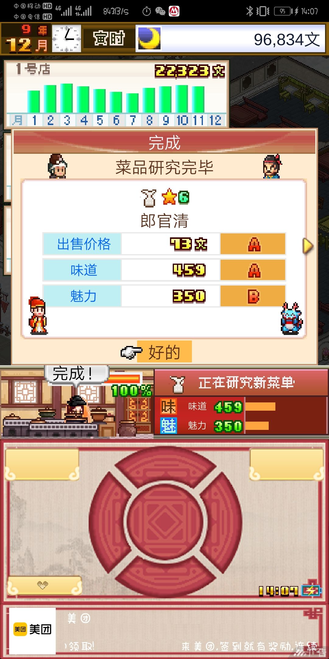 赚钱的核心在于开源节流,所以店里一定要只放一个菜品单价最高的菜。别说什么菜品多元化吸引顾客,这是游戏,进店的客户必然只会点店里有的,要知道,一道菜做的精通比一百道菜做的杂要强的多,你经营的是百年老字号,千年磨一剑,用这个理由说服自己吧。然后,不断用相性匹配是登峰造极的材料开发菜品,这里讲一个开发小技巧,用属性高的厨师开发的时候如果显示研究点数不足,就先把加研究点数那个技能换上,开始研究以后再换上菜系匹配的增幅技能即可,这样做出来的菜属性会好很多,一步一步把这道菜雕刻到完美吧,这就是你的镇店之宝!