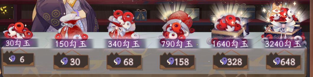 1魂玉等1RMB,1魂玉可以换5勾玉。也就是勾玉除以5就是真正的RMB价值,由于每档首充额外赠送百分之20只有一次,所以就不计算进勾玉价格内。而往后328,648这两档充值一定会送10%,所以如果以后把每档首充都花完之后,建议每次都冲328。不过微氪玩家的话,想把首充都用完得好久,已经变成老油条了🤪🤪。
