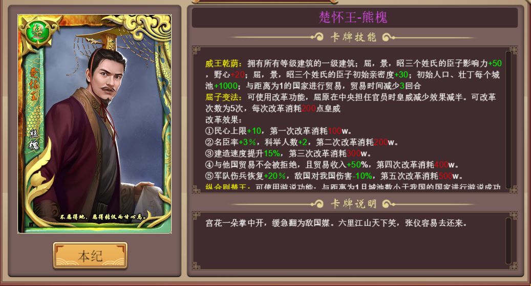 ※新增彩蛋:完成秦皇本纪,开局自带李斯!在历史模式下完成本纪“谏逐客书”后,在任何模式使用秦始皇嬴政进行游戏,开局前朝将自带李斯