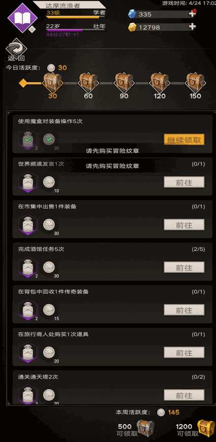 当然,玩家们也完全不必担心无法完成每日任务。全部完成所有任务后共能得到185点的活跃度,因此挑选其中的一部分任务来完成,最终得到150的活跃度还是比较容易的事情哦。在每日任务中,不乏有“世界频道发言”“在集市中出售装备”这样的非常容易既可完成的任务。最后要注意当每周活跃度到达500和1200时,还分别能能够得到宝箱奖励。