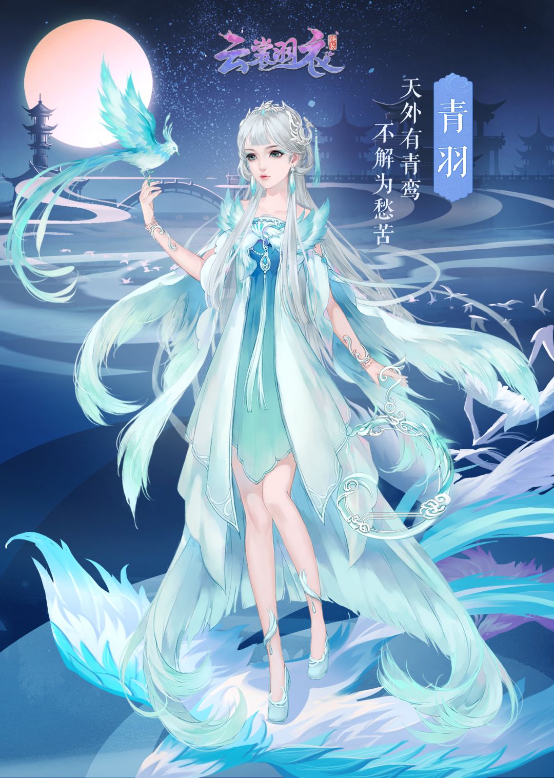 新套装“青羽”则是以上古传说中的“青鸾”为设计来源,“天外有青鸾,不解为愁苦”。青白两色的渐变处理显得如梦如幻,白发上缀有银质青鸟,整体设计也采用了大量的羽毛元素,背景的楼宇与圆月更是恍若仙境。