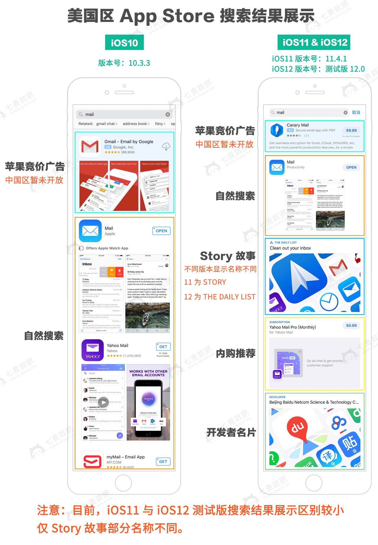 昨天七麦数据根据 iOS 12 beta11 版与 iOS 11 做了相关对比,结论是 iOS 12 在底层系统以及性能层面比 iOS 11 有明显的优化,但在 App Store 功能,尤其是搜索结果页面,变化较小。App Store 的搜索结果页变迁示意图如下: