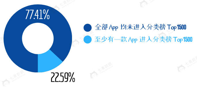 有 43,327 个拥有名片的开发者旗下的所有 App 均未进入分类榜 Top 1500,占比高达 77.41%;