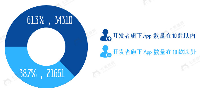 其中 61.3% 的开发者旗下 App 数量在 10 款以内,数量为 34,310 个。特别值得注意的是,有 1662 个开发者旗下仅发布一款 App;