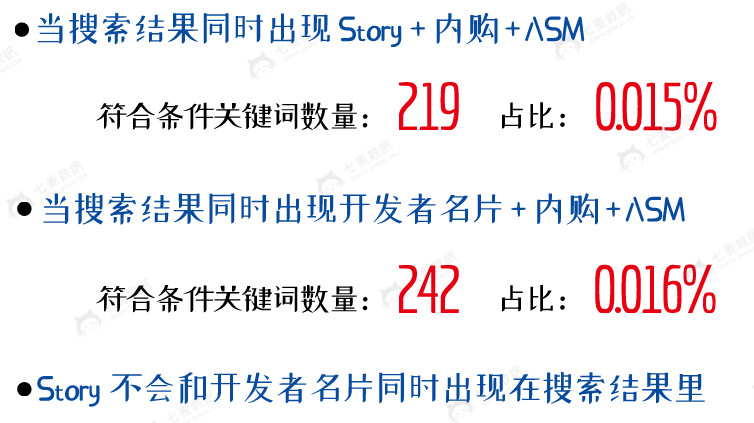 通过以上数据我们可以看出,苹果竞价广告、开发者名片、内购、Story 同时出现的概率极低,自然搜索结果排名的优化(ASO 优化)依然格外重要。