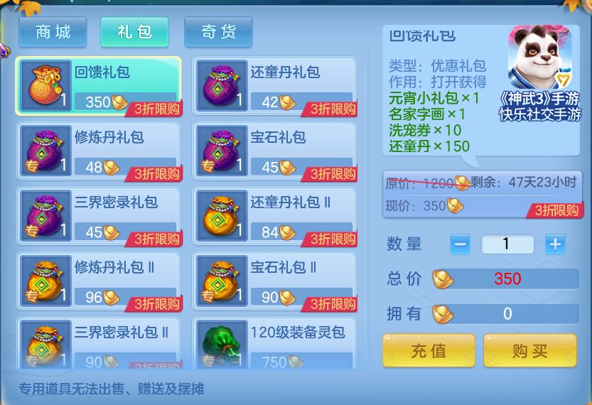 除新玩法、新地图、新宠物、新坐骑外,为了感谢玩家一路陪伴,《神武3》手游还特别上架了“回馈礼包”助力三界少侠快乐成长,即日起至12月12日24:00,30级以上玩家皆可前往商城-礼包分页购买。