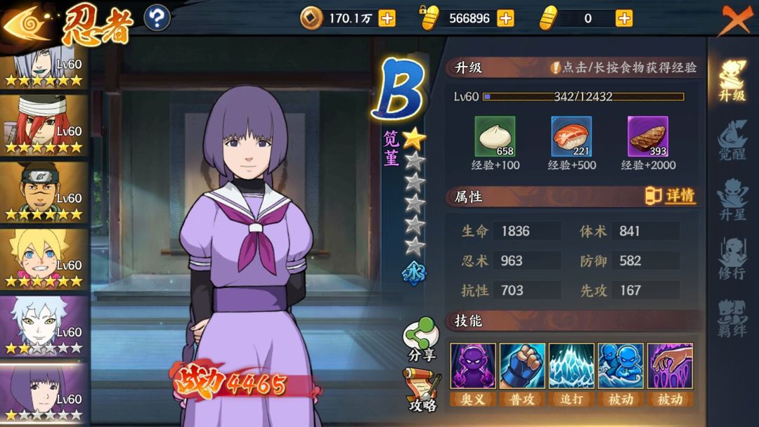 笕堇的属性目前还不是很清楚,因为手里的笕堇是一星忍者,手边的忍者都是满星,没有办法进行对比,所以去竞技场测试了一下,发现生命值挺高的,防御力感觉也不错,但不能当做主要前排忍者,因为放在前排会被秒,而且她的技能也不能当做起手使用。