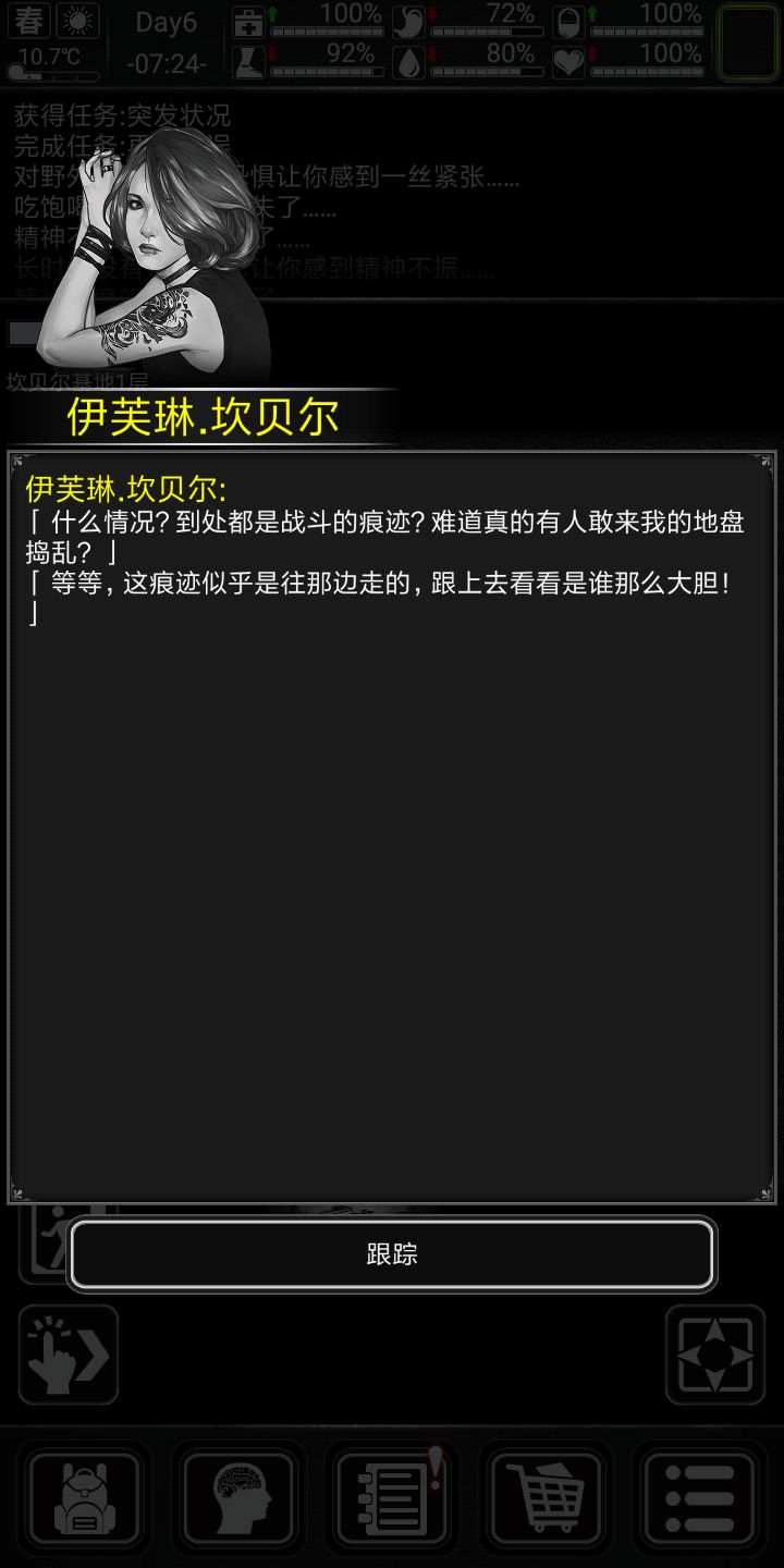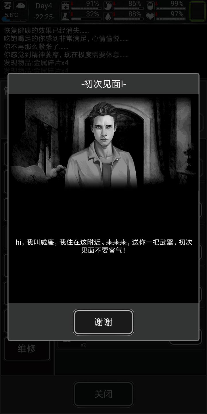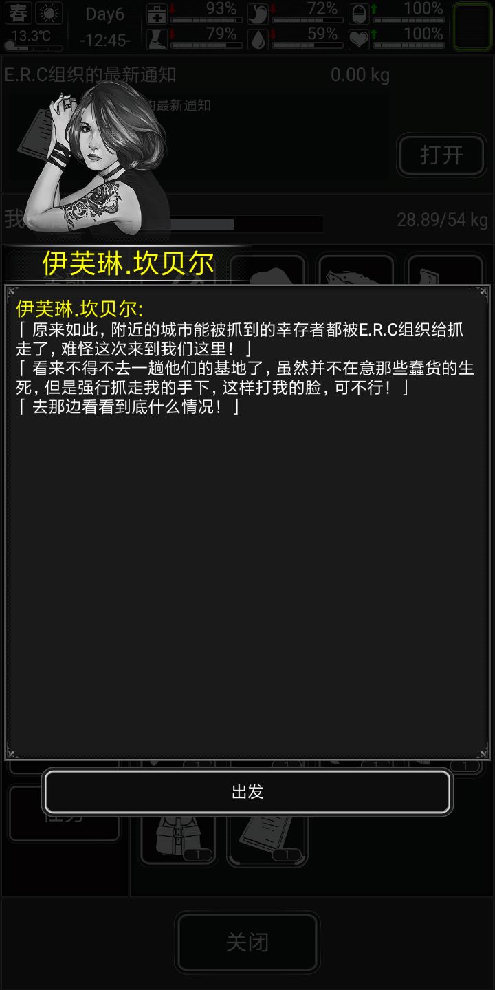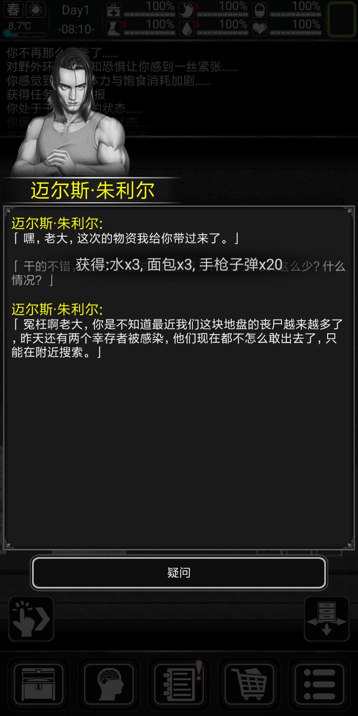 好,说下专属剧情,剧情不跳过,因为小弟前期会给东西,前期让你杀僵尸的任务点会很肥,ERC的劫匪会掉污水,刚好前期缺这些东西,徳维特剧情会给小口径手枪(据说他就是拿那个小手枪打死小天使的,滑稽)子弹,,也会有复仇ERC的任务。好,开始生存(前十天比较困难(顺便给大家看下剧情)会特别详细),渡过前期的童鞋可以跳过第一天