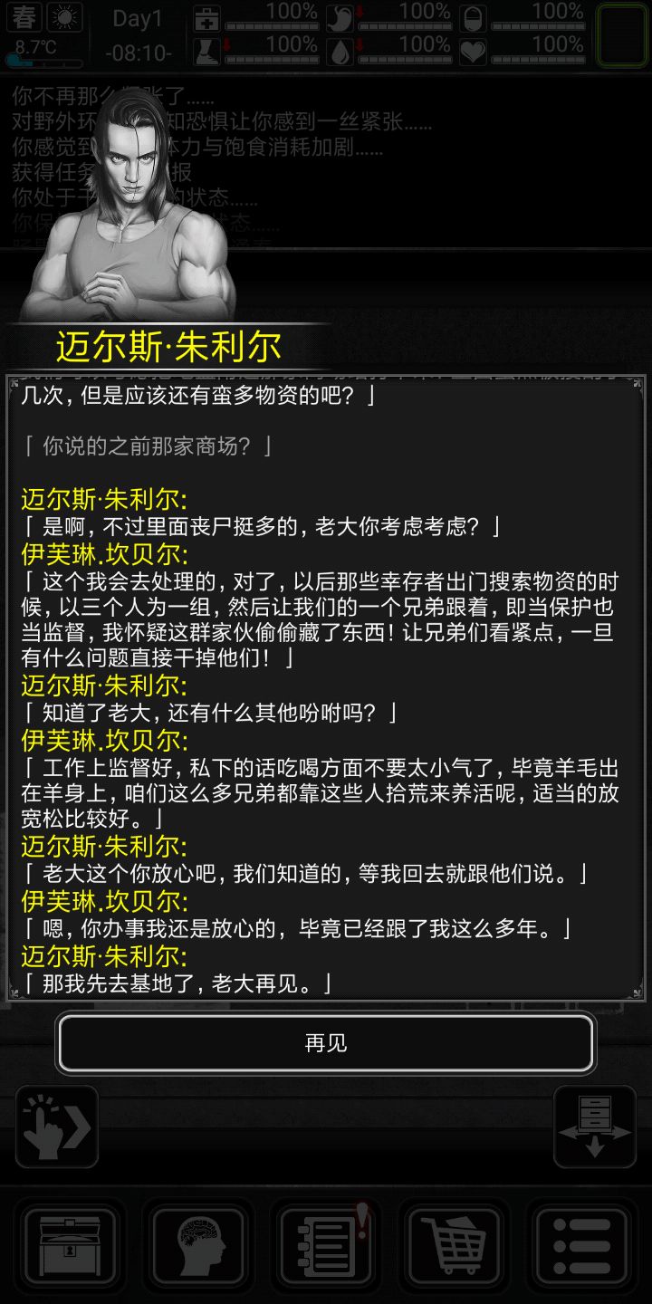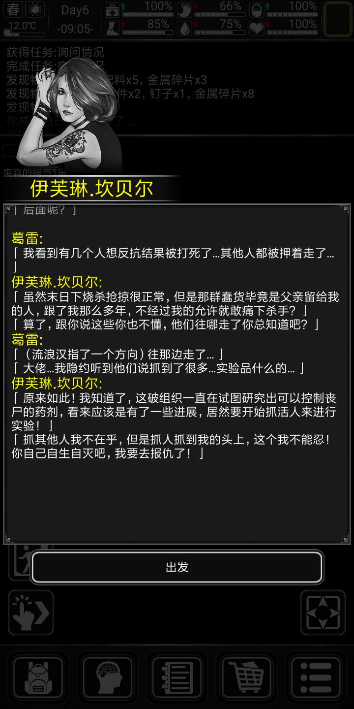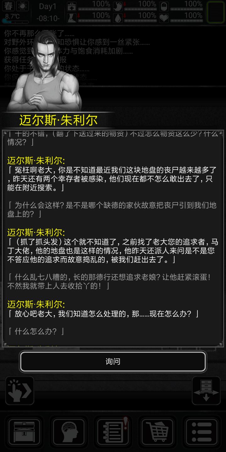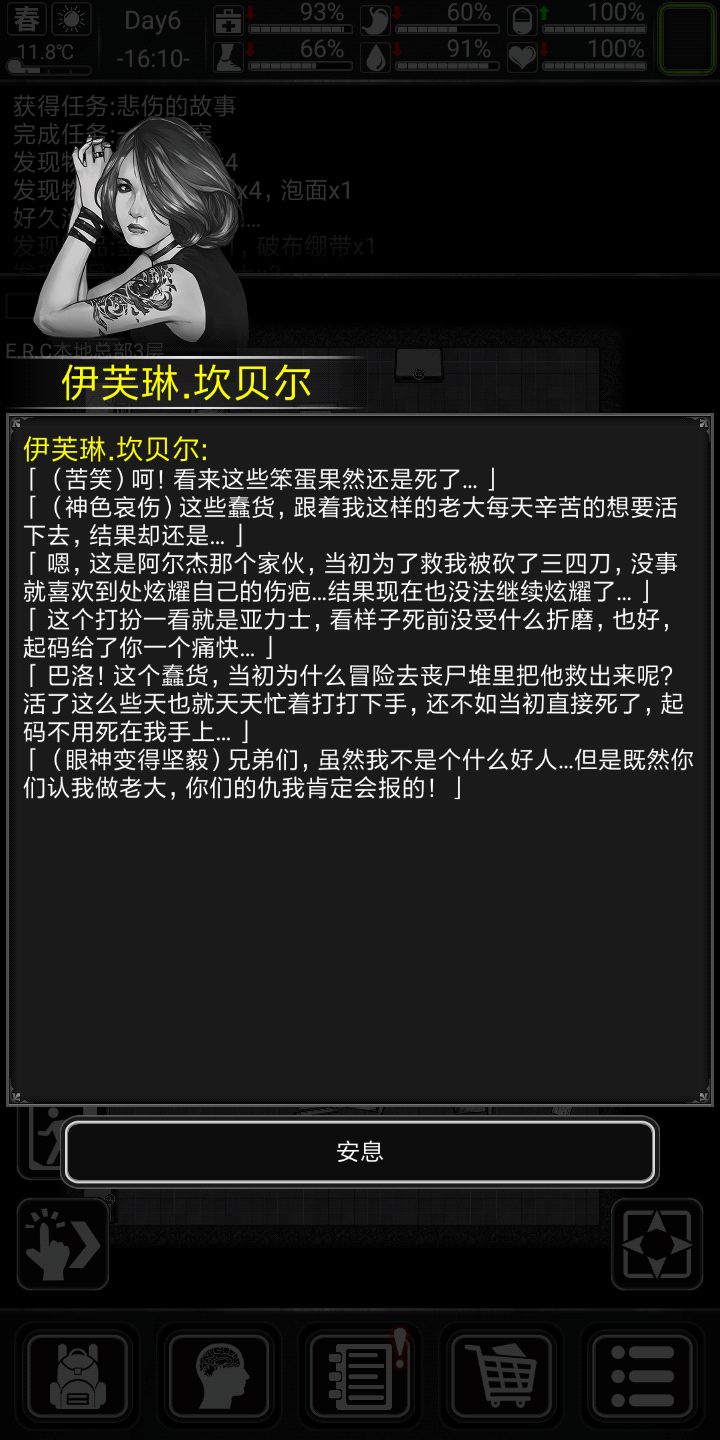 好,说下专属剧情,剧情不跳过,因为小弟前期会给东西,前期让你杀僵尸的任务点会很肥,ERC的劫匪会掉污水,刚好前期缺这些东西,徳维特剧情会给小口径手枪(据说他就是拿那个小手枪打死小天使的,滑稽)子弹,,也会有复仇ERC的任务。好,开始生存(前十天比较困难(顺便给大家看下剧情)会特别详细),渡过前期的童鞋可以跳过第一天