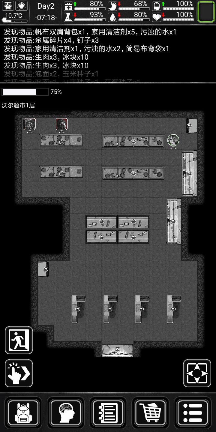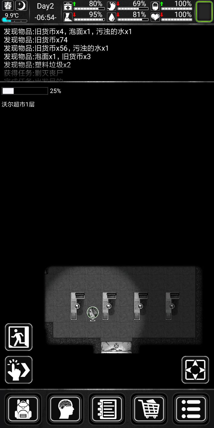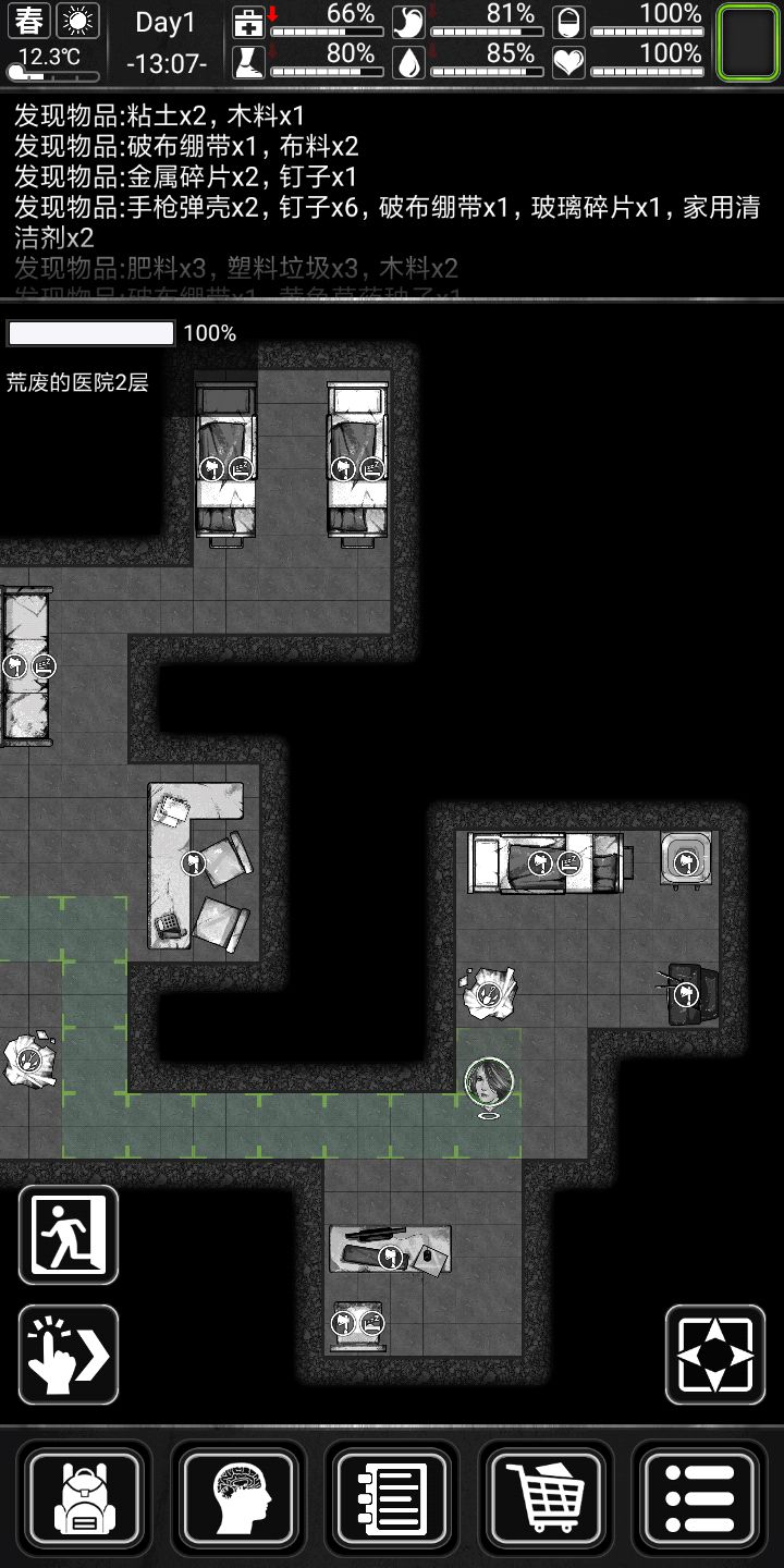 前期搜点中,首选商场,医院,商场有吃的,水,还有塑料,金属啥的,东西很全,最重要的是还有钞票