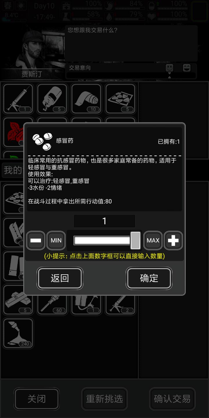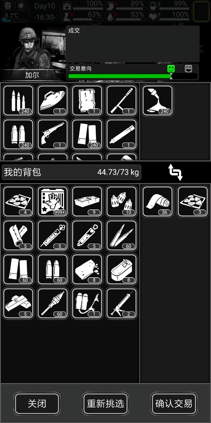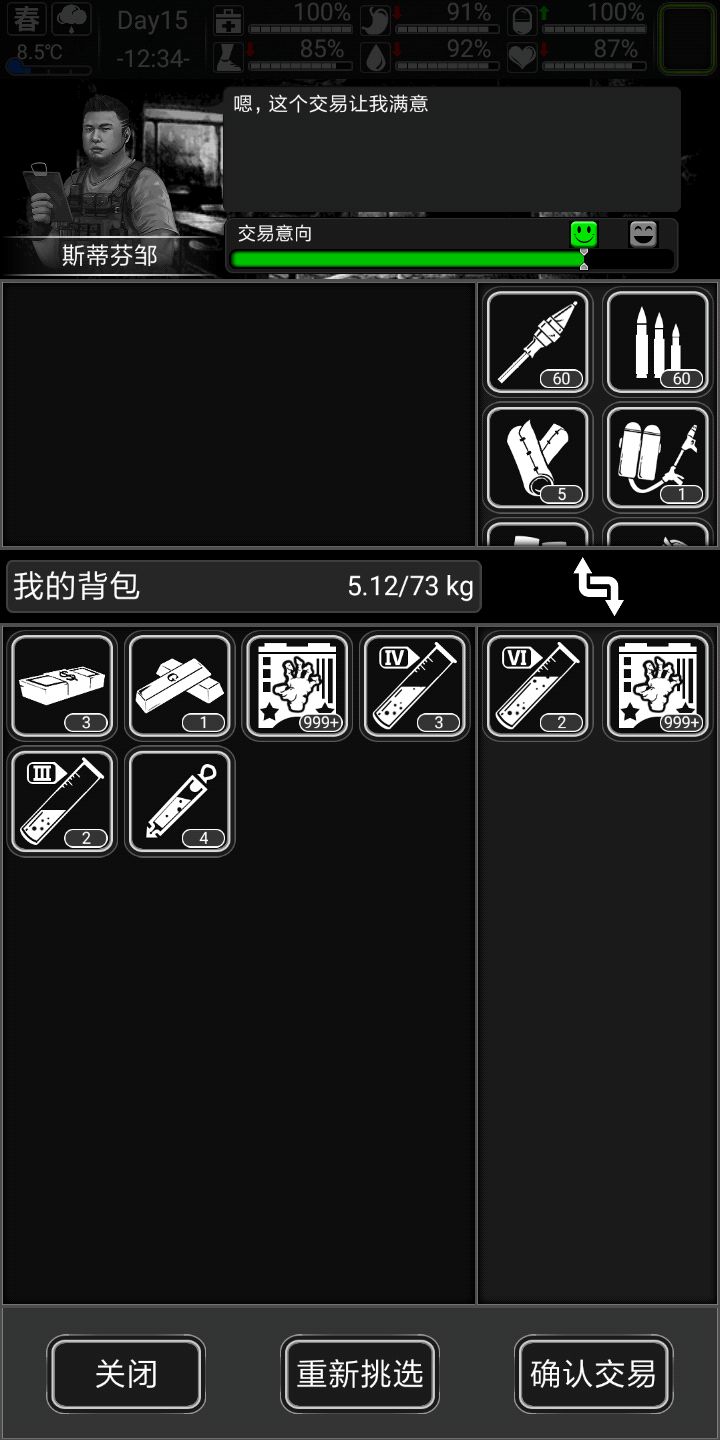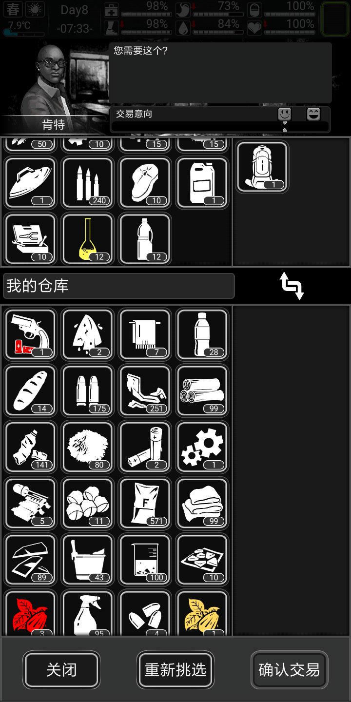 肯特上门,用剩的五个医疗弹和珠宝换了点狙击子弹(前期能买一定买),还买了点塑胶肉汤什么的,跑商收获如上