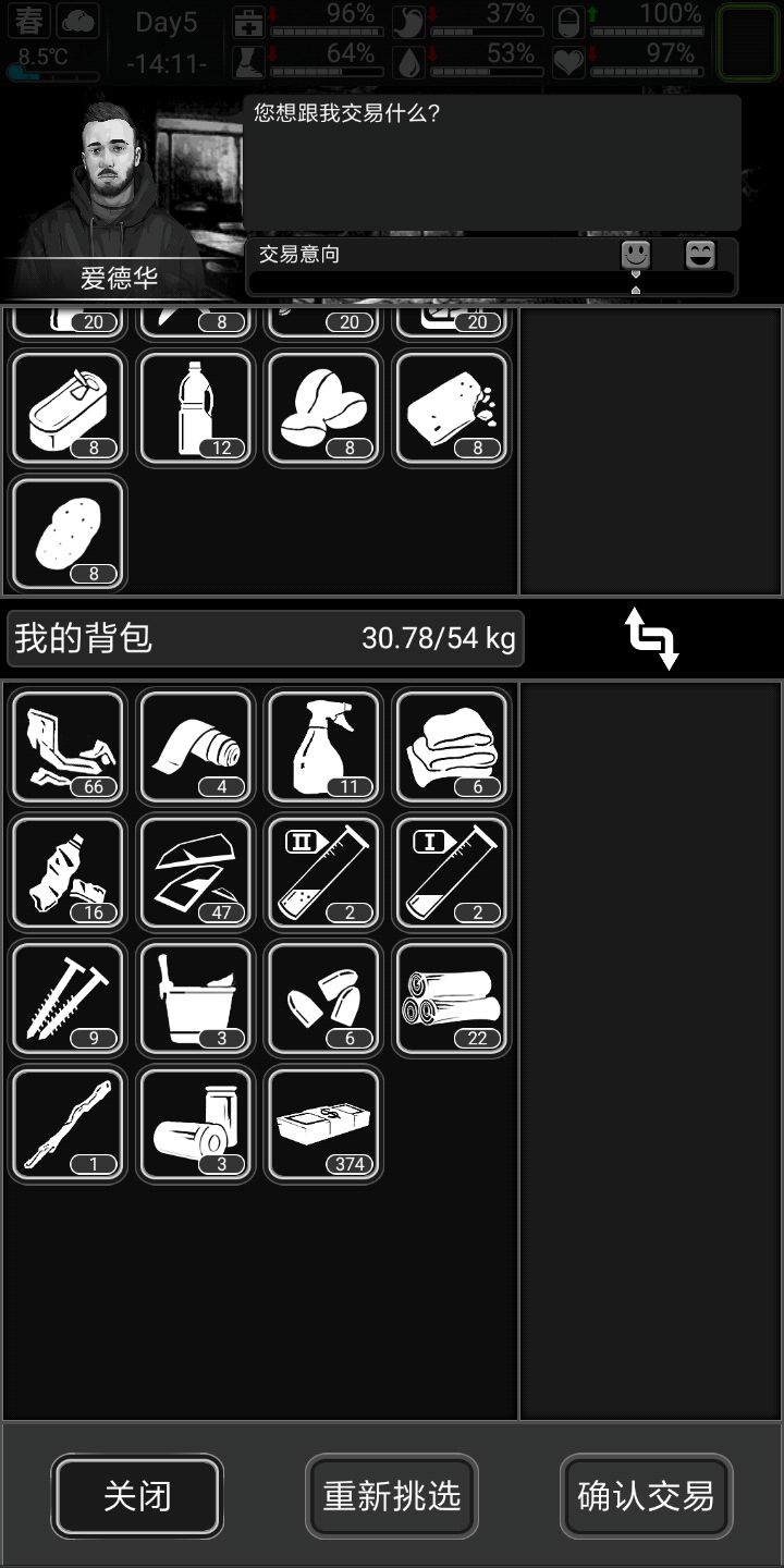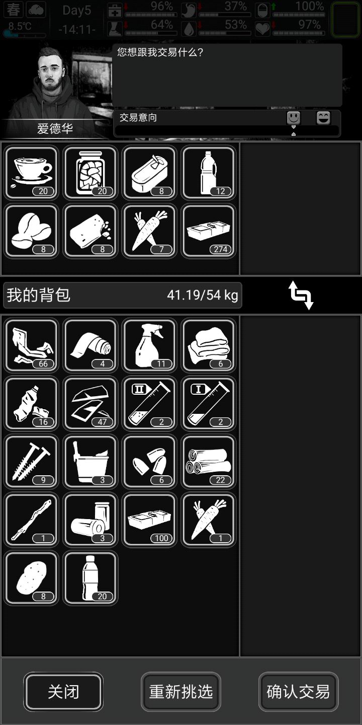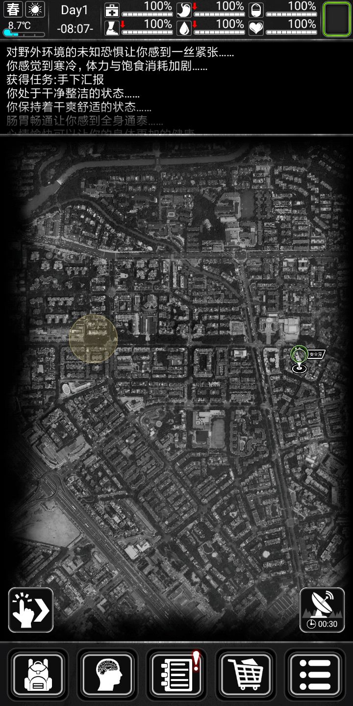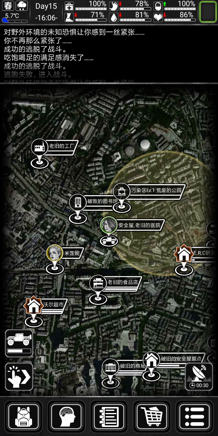记得家旁边搜个公园,下雨后去接水更污浊的水两瓶可以做瓶水很划算。记得每五天跑次商。觉得自己欧皇可以做做詹姆斯邦的任务,个人不推荐,前期几乎没有好东西作息规律,三围(生命健康情绪)保持90以上,另外三围(饥饿水分体力)保持50以上三四级床八小时直接回满也不会精神萎靡。