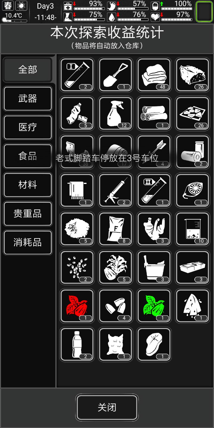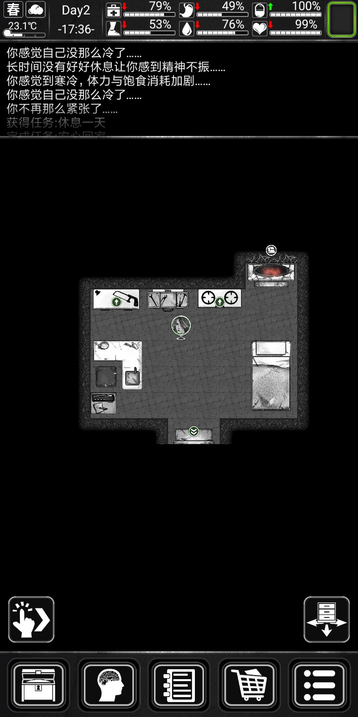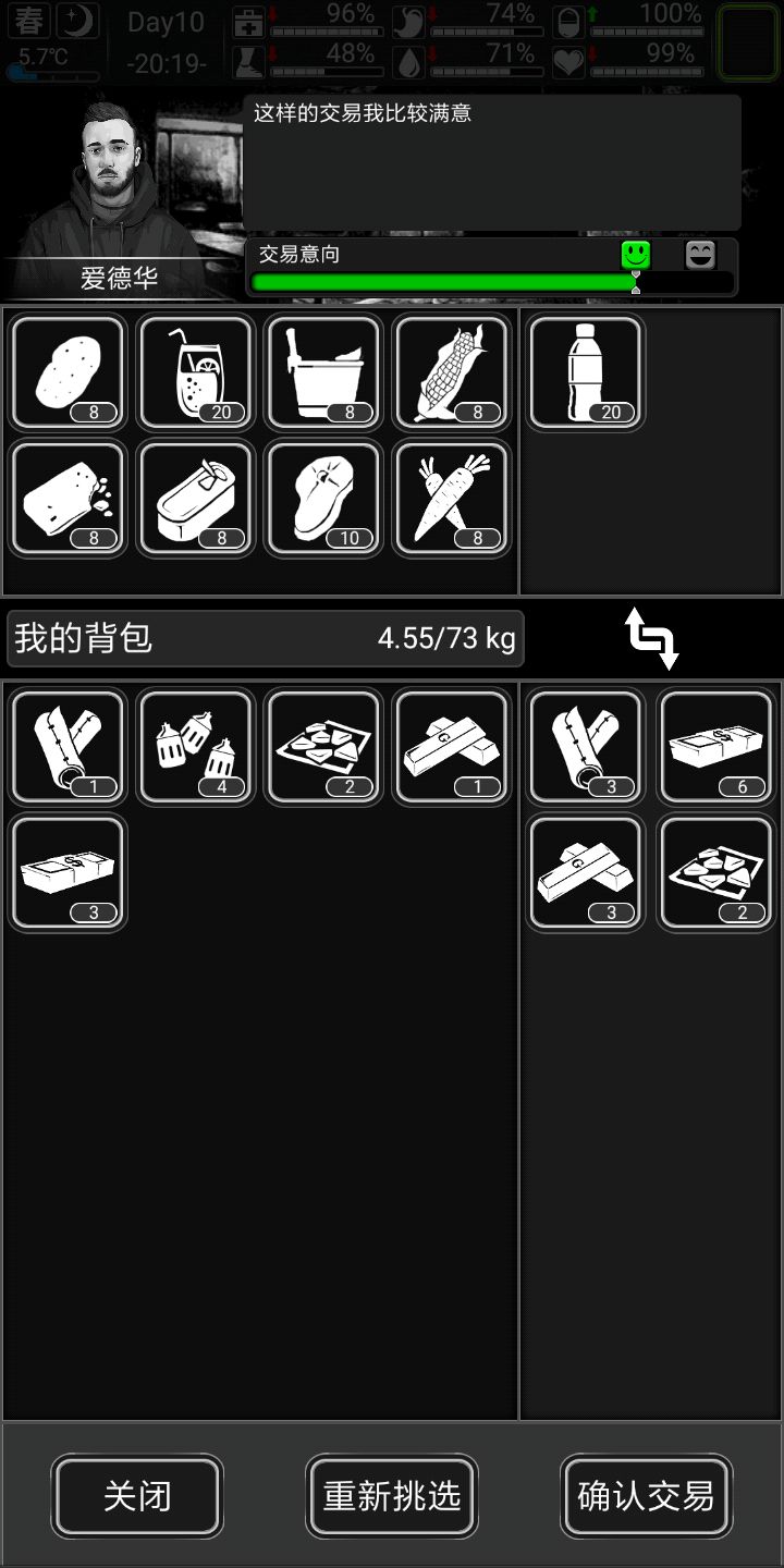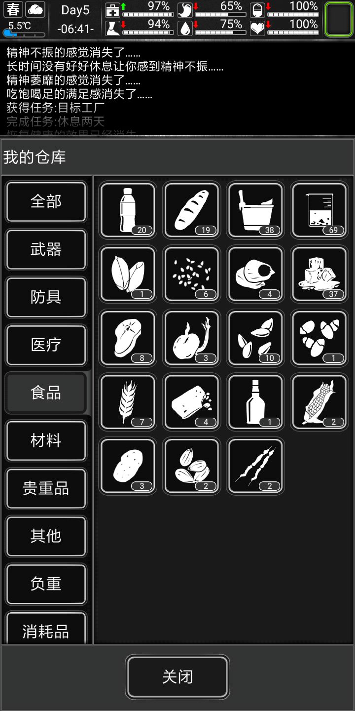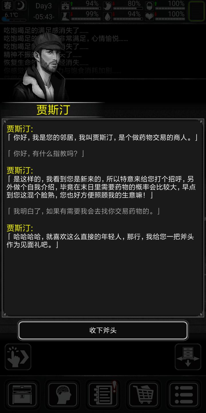记得家旁边搜个公园,下雨后去接水更污浊的水两瓶可以做瓶水很划算。记得每五天跑次商。觉得自己欧皇可以做做詹姆斯邦的任务,个人不推荐,前期几乎没有好东西作息规律,三围(生命健康情绪)保持90以上,另外三围(饥饿水分体力)保持50以上三四级床八小时直接回满也不会精神萎靡。