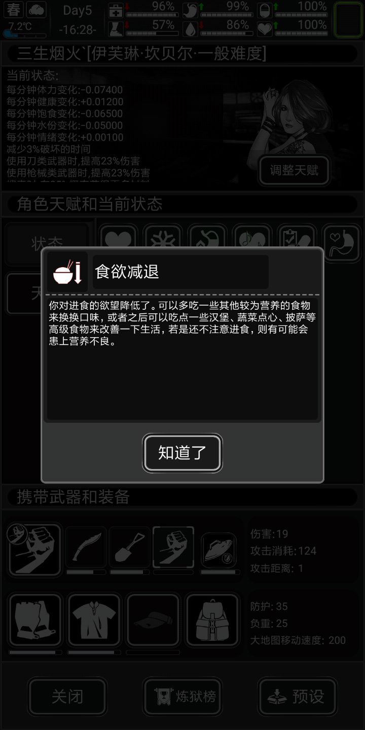 原因:徳维特buff是健康多十而且20以下不适,10以下悲伤,前期炼狱得病更能扛一点,摩托车前期跑图跑商人都很香,上来接近满配也不用操什么心