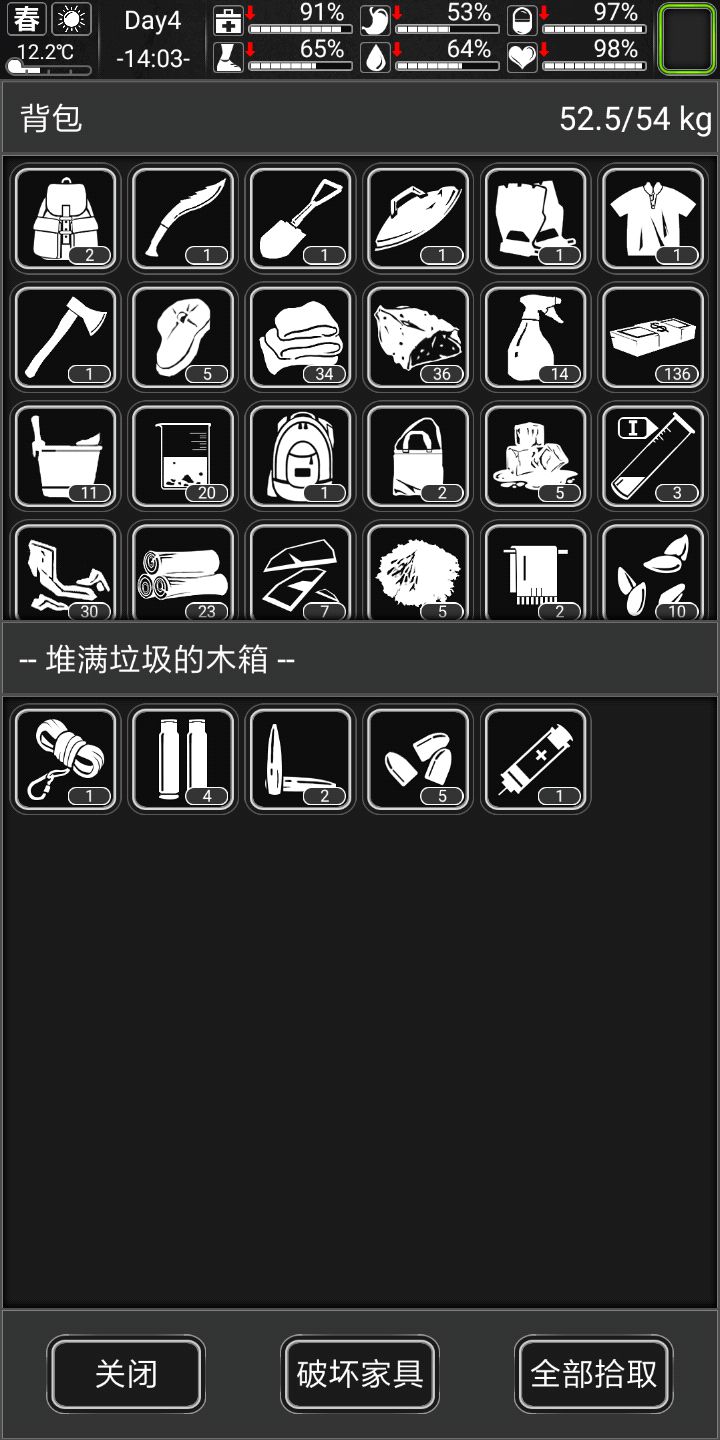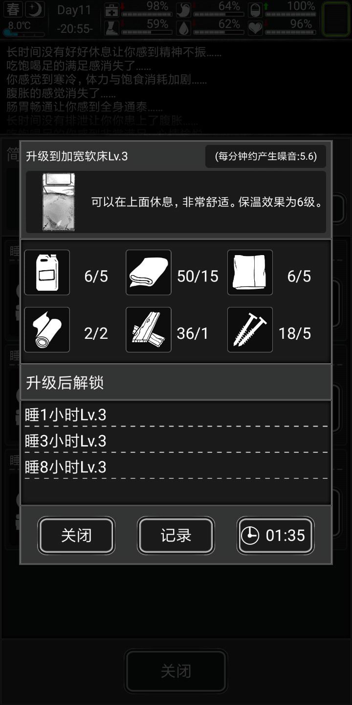 额,回来路上吃了个泡面,。。。回家做土豆烤肉去,继续捡垃圾,做材料,做出温室大棚,种土豆,十二天之后就能解决食物问题啦,做材料,升三级化学台,第五天结束第六天