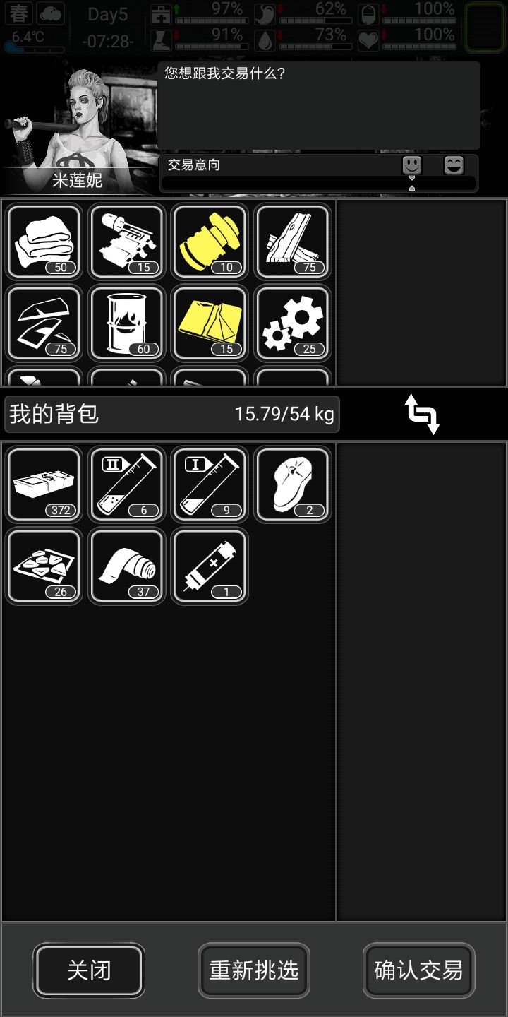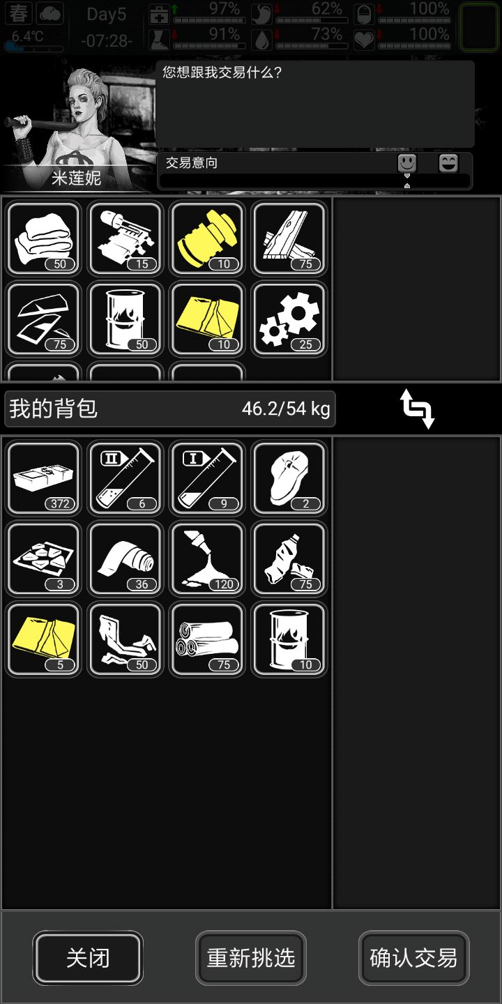 胖子米姐尽量掏空,加尔拿火药,爱德华拿水,贾斯汀拿治病的药💊,前期就是这个流程,晴天捡垃圾,雨天在家搓子弹,做网子,燃料,电池,升科技,刷尸潮。给大家看一下各个商人喜好,交易权重(简单来说就是良心不良心),以及物品价值(大佬的图)不是我的(捂脸)