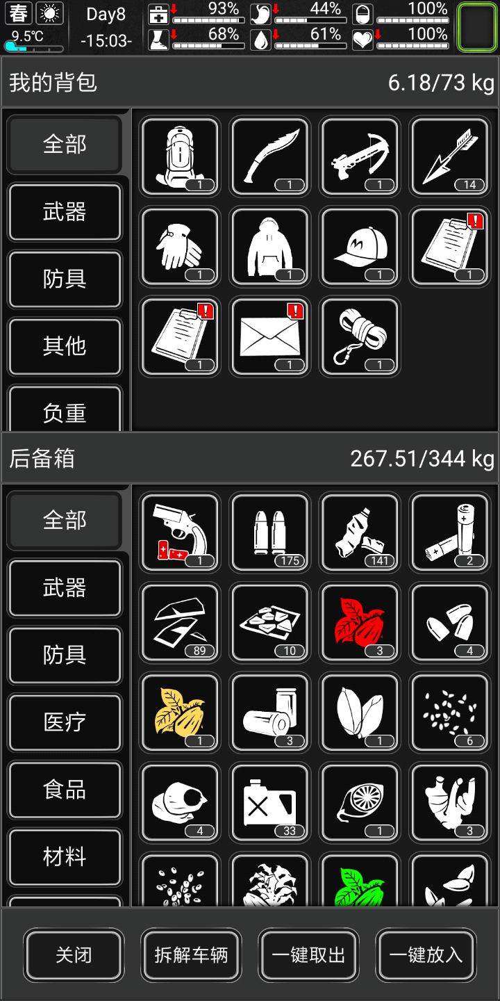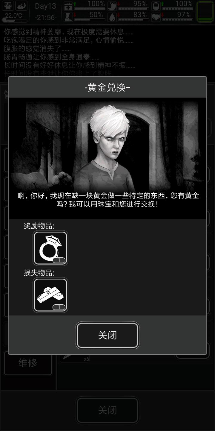 记得留根金条换珠宝,下雨天就别出去了,做点网,燃料,电池,子弹