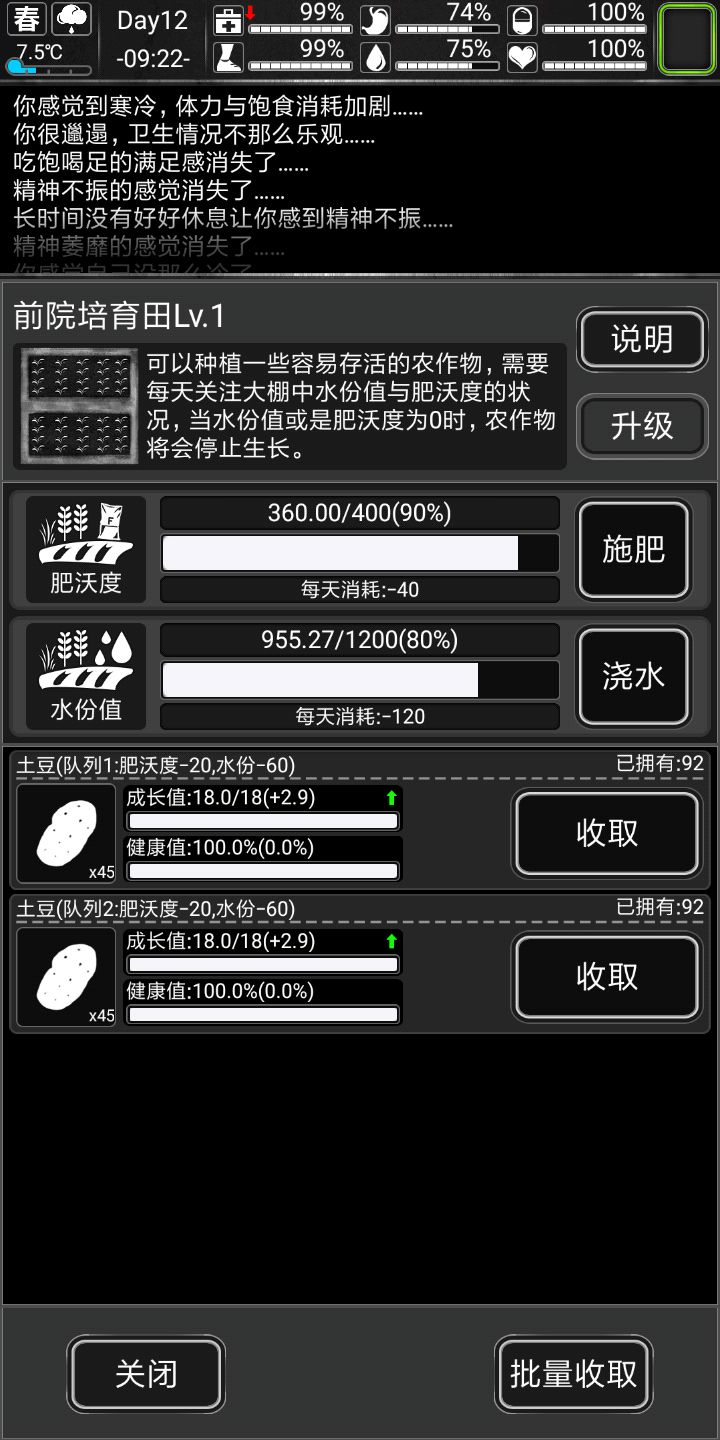 田地每天都去看一眼。保持水分肥沃度都在80以上(75以上提供1.2生长值)。土豆种到够吃就种烟,做粗烟(烟交易挺值钱的)。,夏天种西瓜(也可以种点不应季的,毕竟夏天应季的太少)