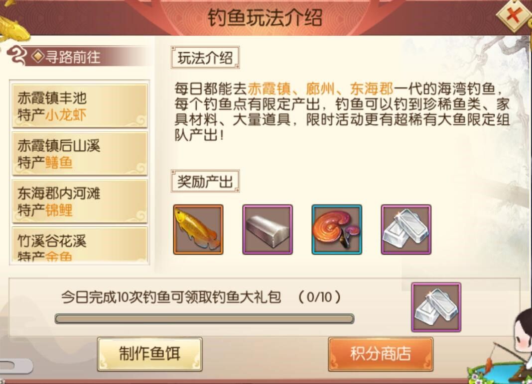 在烟波钓客活动中,玩家可以在赤霞镇、竹溪谷、廊州、东海郡一带的水域钓鱼,不同的水域将有不同的水产和道具产出,其中包括各种珍稀鱼类、家具材料和稀有道具等。值得注意的是,每次钓起的三种物品只能选择其一,珍稀鱼类可以用来兑换大量的钓鱼积分;而各类家具材料则可以帮助玩家在家园中建造各种稀有家具,以此来增加自己家园的豪华程度;此外还会有高级藏宝图合成材料等资源,玩家可根据自己的需求程度来进行取舍。