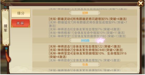 先看一张橙色援军的光环效果图。橙将的光环通常会出现在他们突破+4时,就能获得一个光环效果。假设一个橙色援军突破到+13,可以获得4-5个光环,其中部分为“友军限定”,即场上所有武将都能享受光环,另一部分为“阵营限定”,也就是说场上所有蜀国/魏国/吴国/群雄可以享受光环。