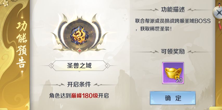 1 ) 当少侠达到巅峰180级后可以在游戏右侧看到圣兽之域开启的提示,全新帮派战玩法来袭!稀世圣装等你解锁!
