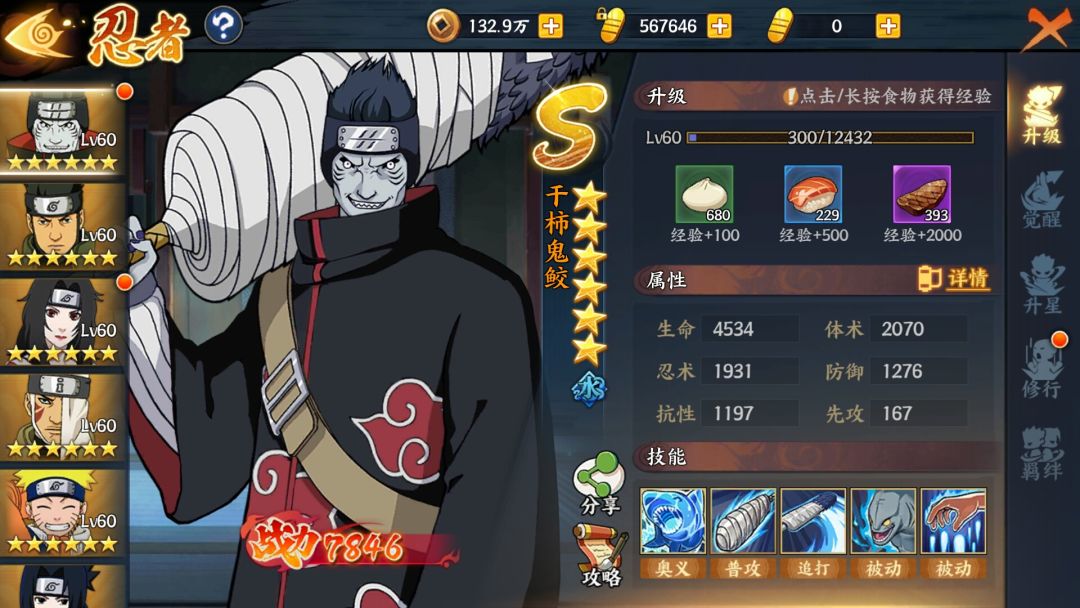 干柿鬼鲛的属性还算可以,生命值明显高一些,但也没有特别的高,毕竟干柿鬼鲛也不是什么前排忍者,所以生命值太高会脱离这名忍者的定位。干柿鬼鲛的防御属性是正常水平,反而是抗性有点低,受到忍术伤害,会痛一些。至于忍术和体术都是正常水平,没有太大的亮点。