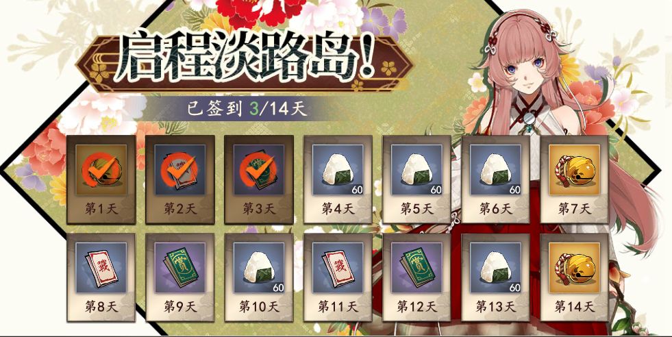 活动期间每日登录游戏可在活动页面领取相应登录奖励,总计可获取:饭团*300,日之铃*3,挑战状*3,以及幕府文书*3,小伙伴们不要忘记了哦~