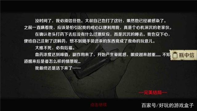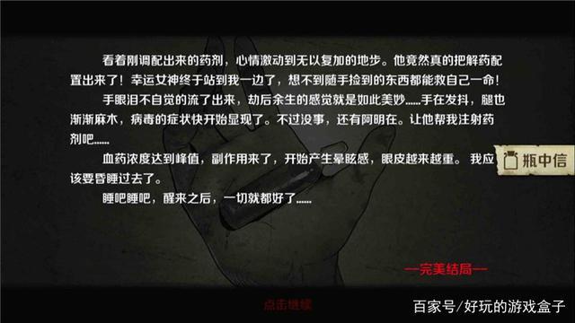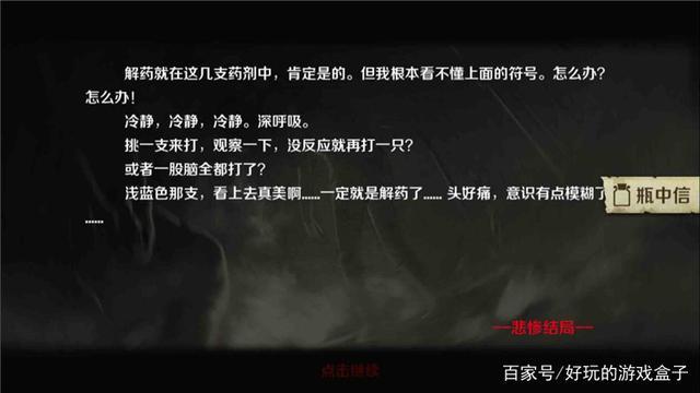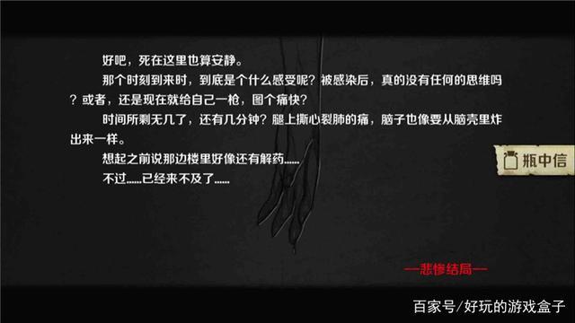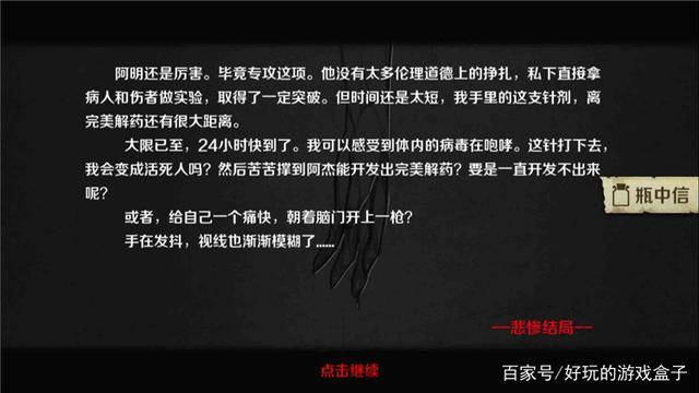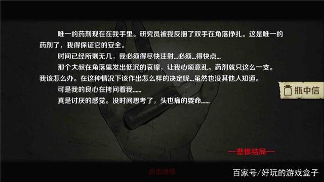 小镇路线—阿明、女孩存活,(ABC资料、药瓶、使用说明)在主角背包里—选择实验室。