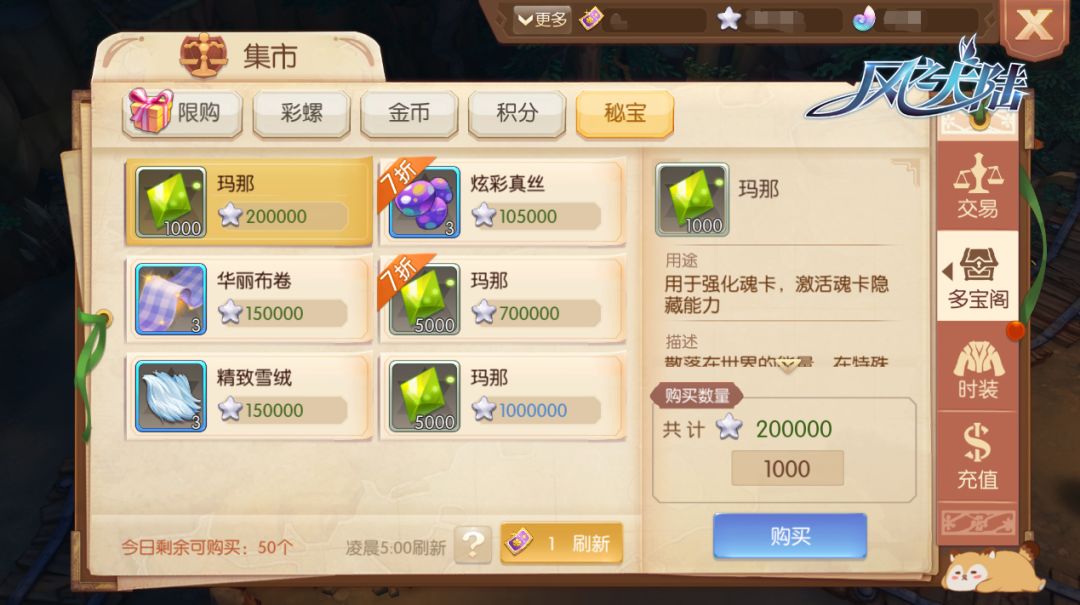 在集市商城,你可以使用王国金币或王国声望,分别在金币商店和积分商城购买日限购的玛那。或者,你也可以通过刷新多宝阁中的商品,使用银星购买玛那。如果你迫切需要玛那资源,还可以在日限购礼包中购买能量源泉礼盒。