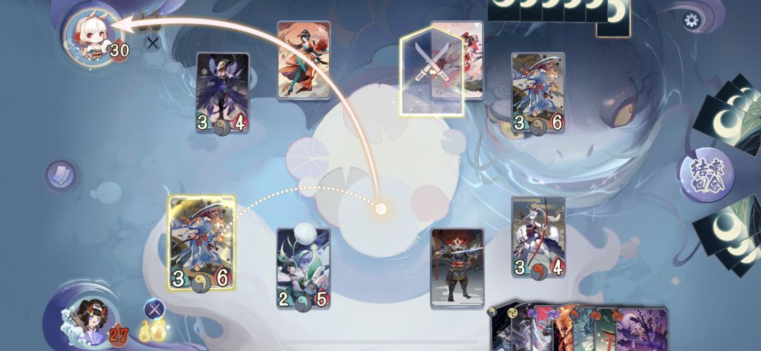以犬神为例,”恶即斩”可以提升4点攻击后发起进攻,”心斩”可以获得2点护甲后发起进攻,而”守护”不仅可以主动使用,在敌方回合时若我方式神受到攻击,消耗所需鬼火后还能够自动从手牌发动。