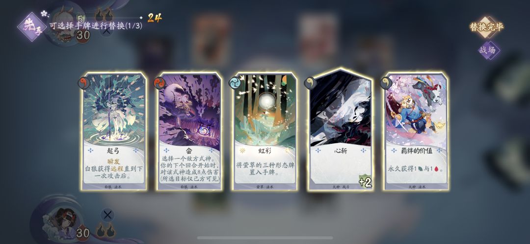 牌局开始之前,系统会随机决定一方先手,决定好先后顺序后,双方各自从自己的牌组里抽取5张卡牌,并可以根据手牌情况,决定是否更换卡牌,最多有三次更换卡牌的机会。更换完毕后,战斗开始。