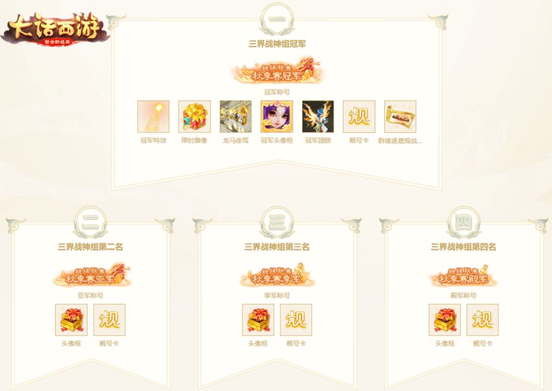 符合以上报名条件的玩家们在确认好自己可以进行报名的组别之后,记得在报名开启之后前往游戏中,以5人队伍的形式进行报名。本次秋季赛,同样将采用各组别独立积分赛+淘汰赛的方式进行,其中积分赛将采用匹配对战模式,淘汰赛则采用BO3赛制,胜者晋级败者淘汰,冠军将获得冠军专属称号、冠军专属特效、龙马座驾、专属头像框、人物翅膀、群雄逐鹿观战邀请函、靓号卡等珍稀奖励,二到四名可获得对应专属称号、对应头像框和靓号卡。此外,免费服和时间服最高组别入围淘汰赛的选手就可以获得酷炫称号、见闻录和神兽属性卡,丰厚奖励正等待三界高手们前来争夺!