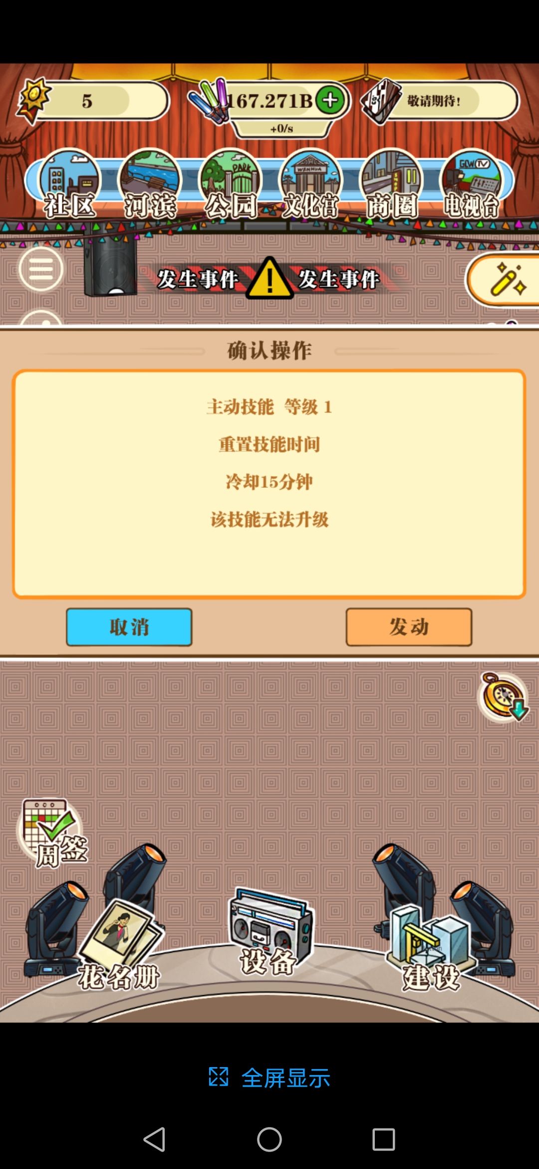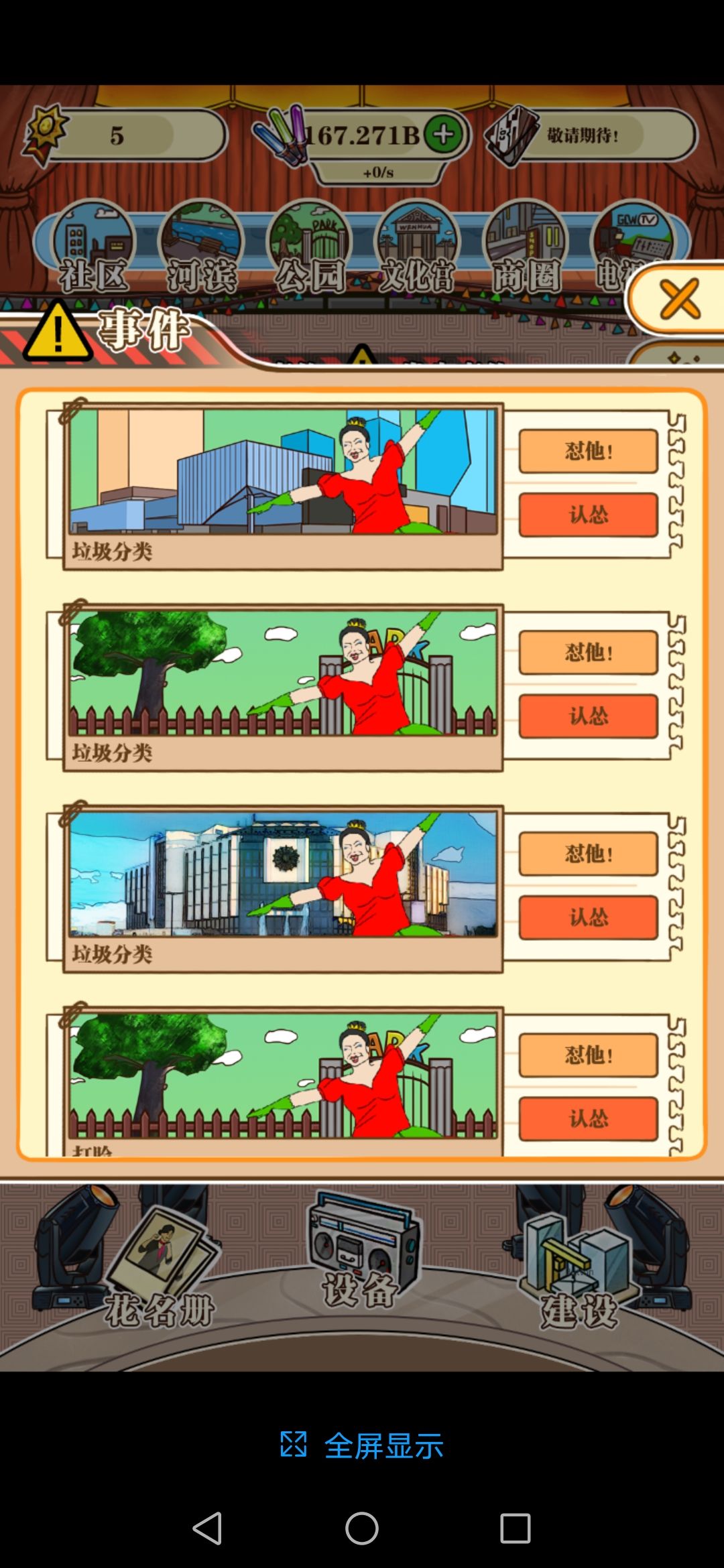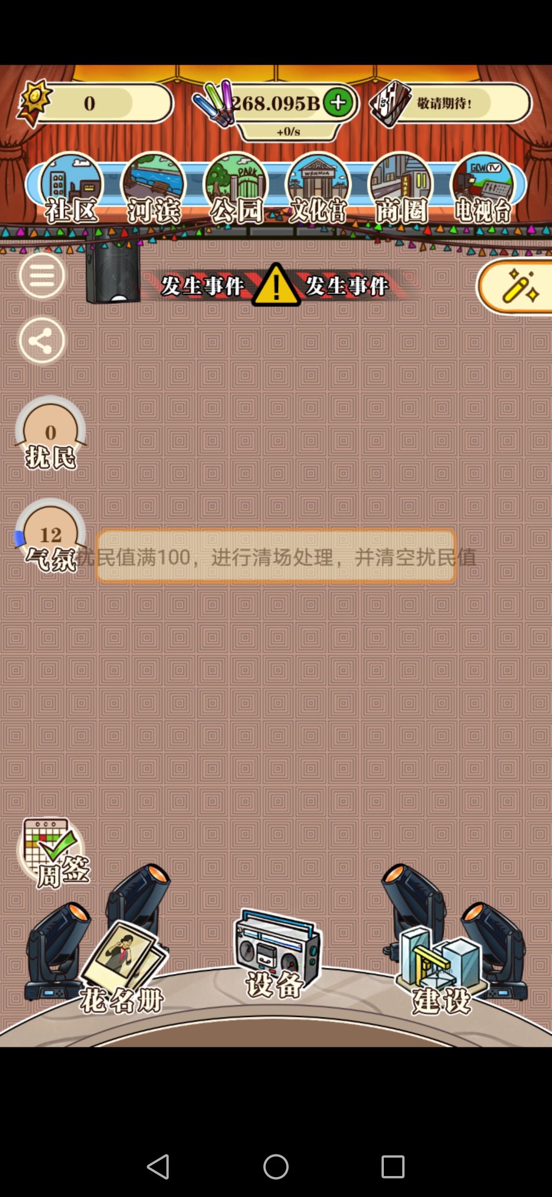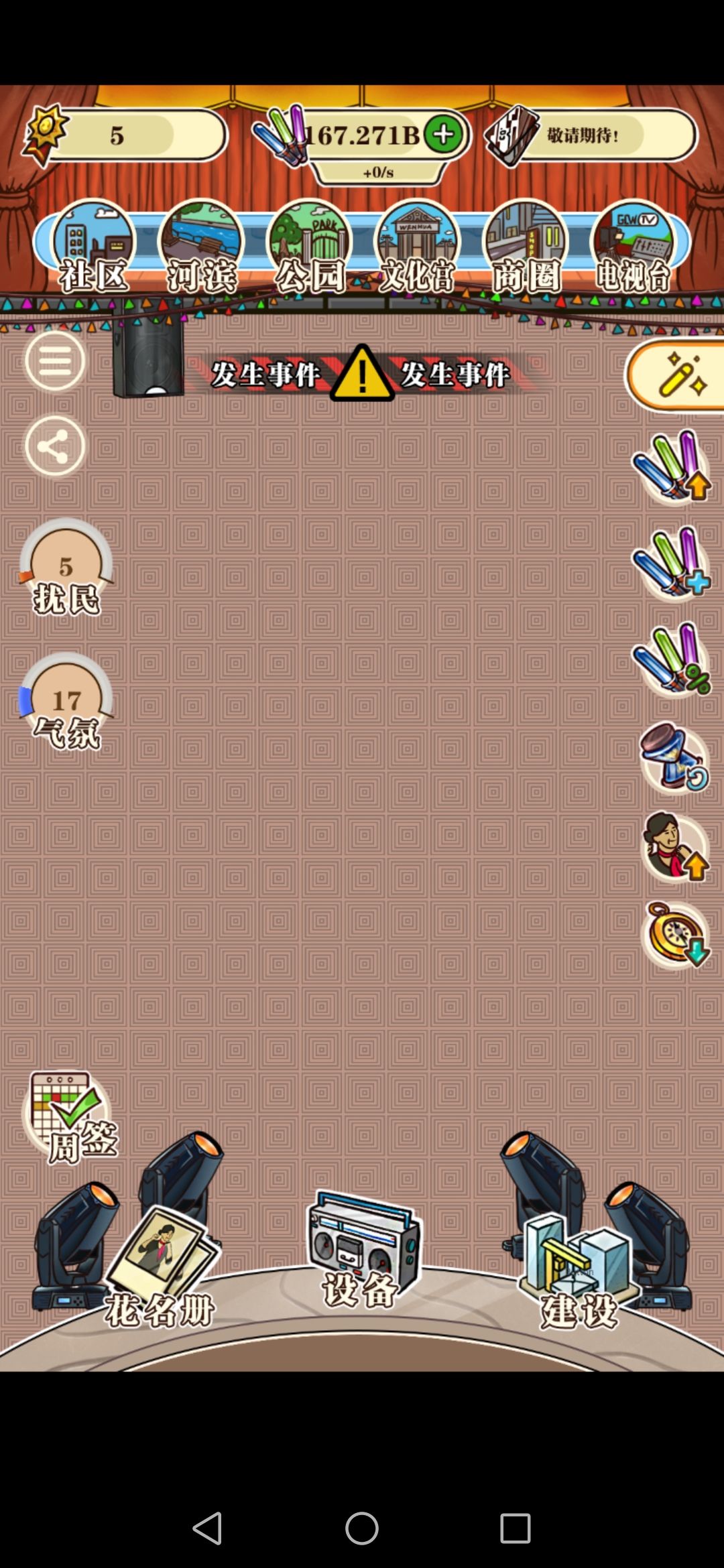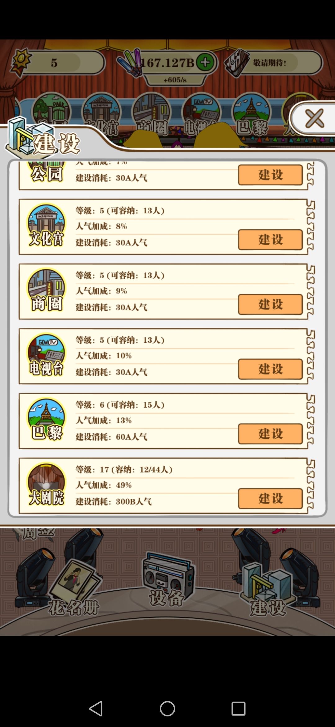 建设到13级以后,每升一级难度很大,但他的人气加成非常好用,建议各位直接开最后的那个,因为前面开了也不会用到,也没什么过渡期可言,而且高级的场景可以使“扰民”上升速度变慢。