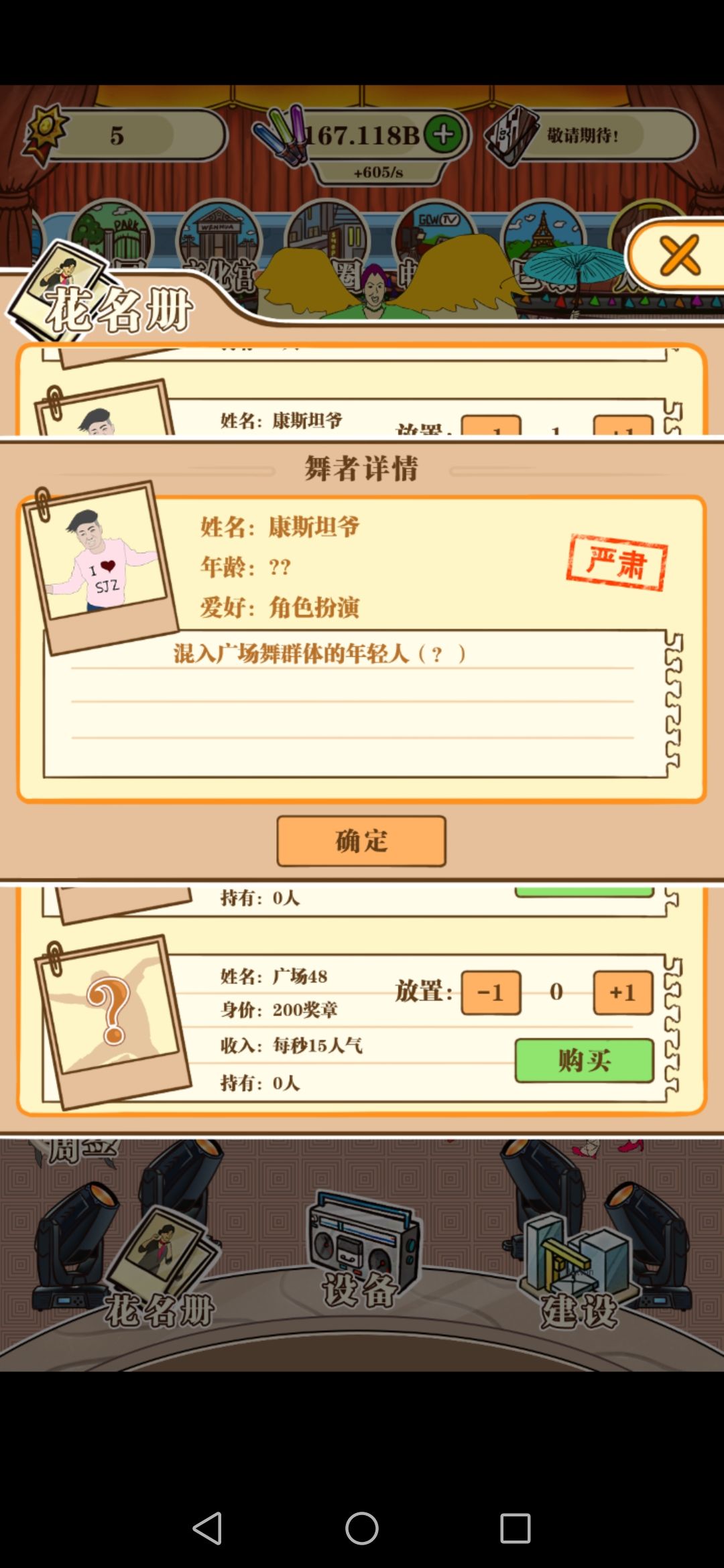~人物确实非常够沙雕,跟我有的一拼(滑稽)但人物之间解锁的难度跨度太大。当所有人被清空之后,必须要用手一个一个的去点,才能把人物放进场景中。非常不方便,强烈要求有“全部放入”这一按钮。
