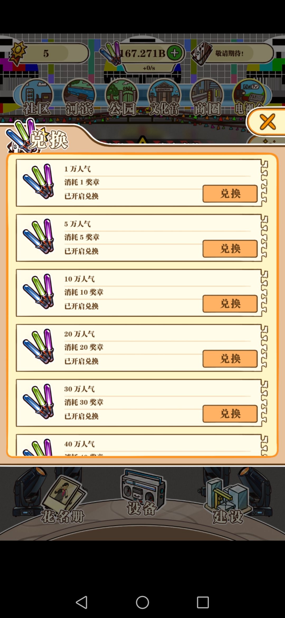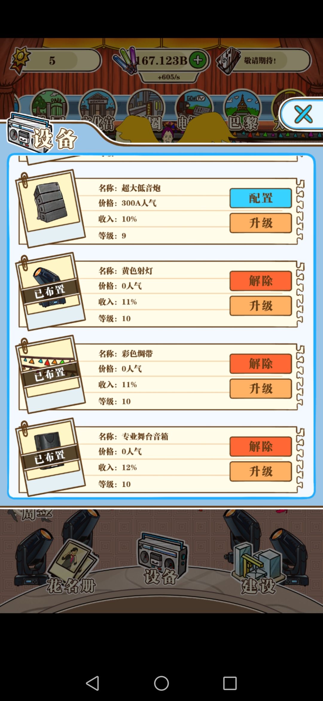 设备的种类也很多,升级设备会得到人气(分数)加成。目前最高等级为10级。